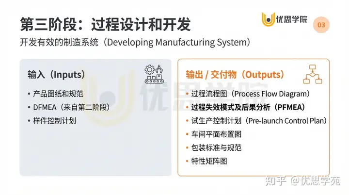 第三阶段是设计制造过程,即确定通过什么样的工艺、工装、设备将产品制造出来并且满足质量、产能节拍等各项要求;此过程是指量产过程而非样件制作过程。涉及工具:过程流程图、PFMEA、控制计划等。
