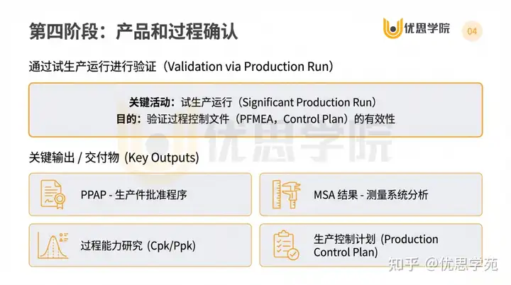 简单讲前面两个阶段分别确定了图纸和制造工艺,“万事俱备只欠东风”,那么下一步就是要试运行一下,看是不是可以生产出满足顾客要求的东西来———这其实就是 PPAP 认可阶段,往往我们要生产一个班次或者几百套零件,以确是不是真的满足了质量和产能要求。涉及工具:统计过程控制 SPC、测量系统分析 MSA、过程能力分析 PP/PPK、PPAP 等。