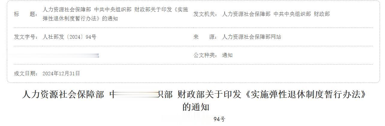 参考资料:人力资源社会保障部 中共中央组织部 财政部关于印发《实施弹性退休制度暂行办法》的通知—人社部发〔2024〕94号