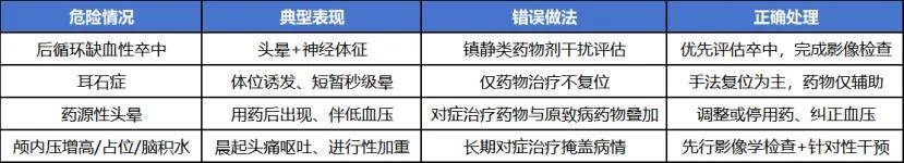 然而,这些属于对症治疗,并非病因治疗。在特定情况下盲目使用,可能导致病情掩盖、诊断延误、神经功能损伤加重,甚至危及生命。本文系统阐述4类不宜盲目使用上述对症药物治疗头晕/眩晕的高危情况,以期为临床决策提供参考。