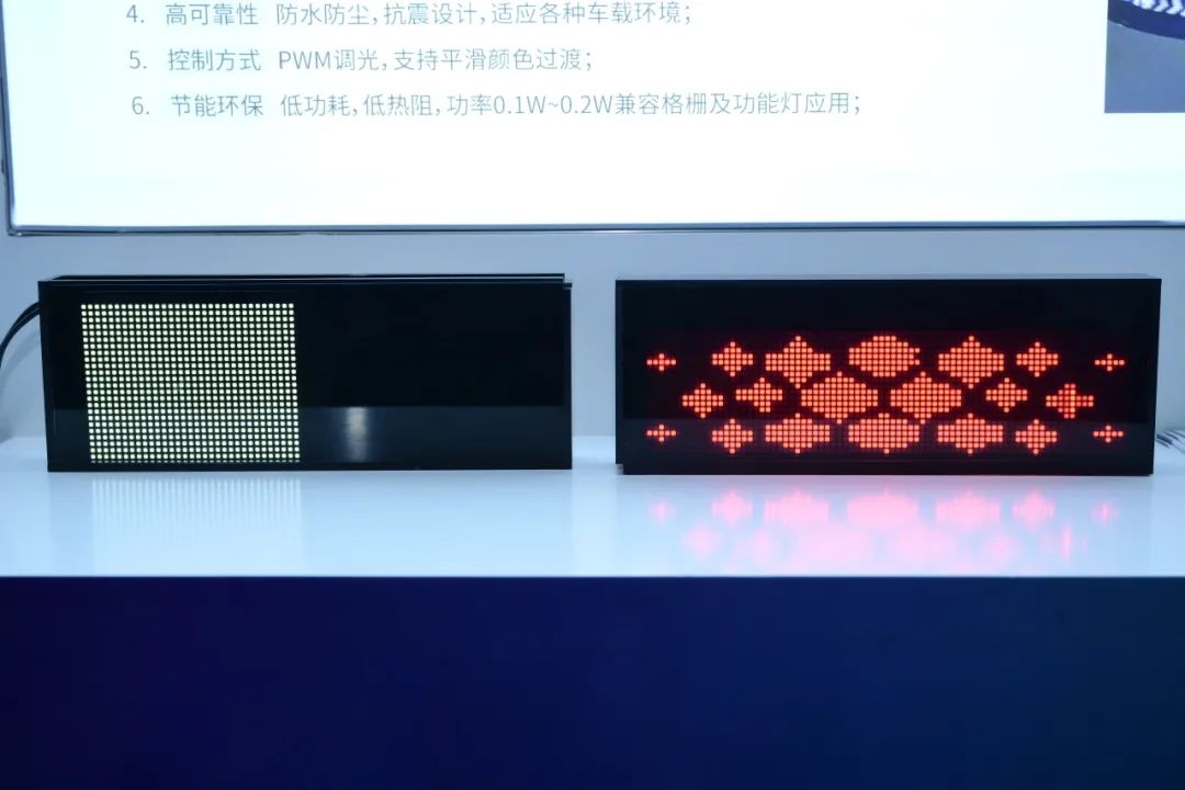 研讨会现场,瑞丰光电凭借一系列创新成果吸引了众多参会者关注。其中瑞丰光电交互屏LED解决方案从灯珠到模组一体化设计,单颗LED面光源均匀发光无暗区,可实现1600万种颜色混合,具有高对比度,支持个性化智能灯语显示,超小功率兼容格栅灯、尾灯与功能灯应用等场景融合,通过清晰的像素化图案,与车载系统联动,赋予汽车智能交互更多潜能。