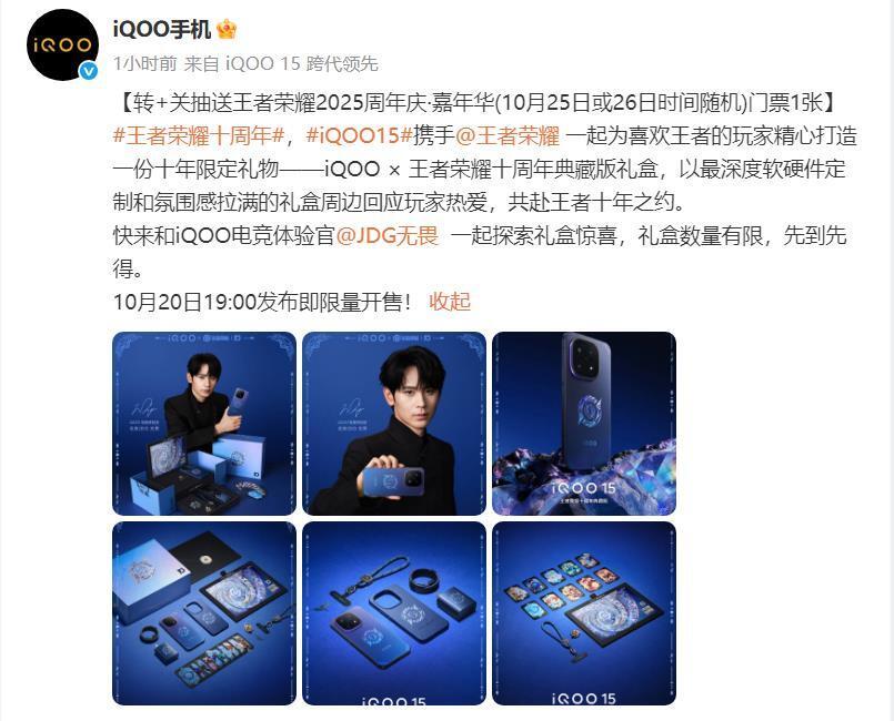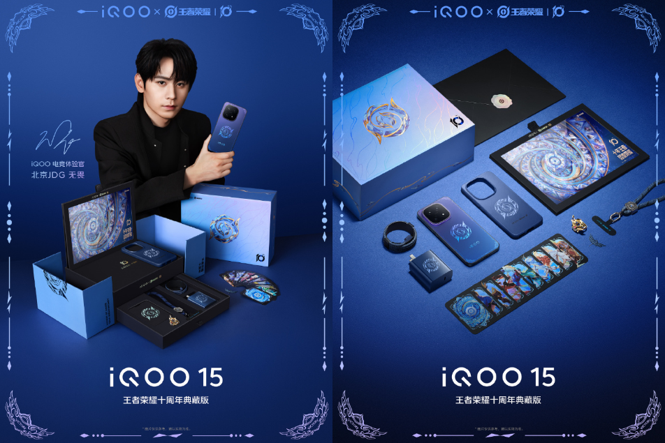 日前,@iQOO手机 持续官宣预热,发布了iQOO15王者荣耀典藏版的九宫格预热海报,并配文称,“#王者荣耀十周年#,#iQOO15#携手@王者荣耀 一起为喜欢王者的玩家精心打造一份十年限定礼物——iQOO × 王者荣耀十周年典藏版礼盒,以最深度软硬件定制和氛围感拉满的礼盒周边回应玩家热爱,共赴王者十年之约。”
