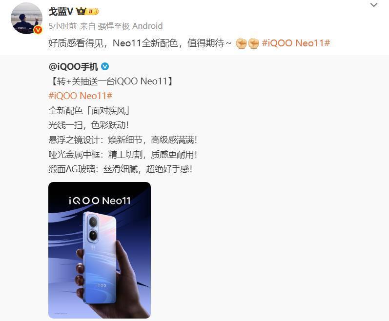 维沃移动通信有限公司 iQOO Neo产品经理 @iQOO慧慧子 (罗佳慧)转发了这条微博,并表示,“每一次外观配色打磨,都不只是“好看”那么简单。从Neo全新升级金属中框和悬浮之镜设计,到IP68&69,我们在质感、手感、耐用性上都做到极致。这,就是「面对疾风」的底气。”iQOO产品经理 @戈蓝V 则表示,“好质感看得见,Neo11全新配色,值得期待”。据悉,“面对疾风”的名称与《英雄联盟》中角色亚索的经典台词“面对疾风吧”高度相似,由此推测iQOO Neo 11极有可能与亚索进行联名。