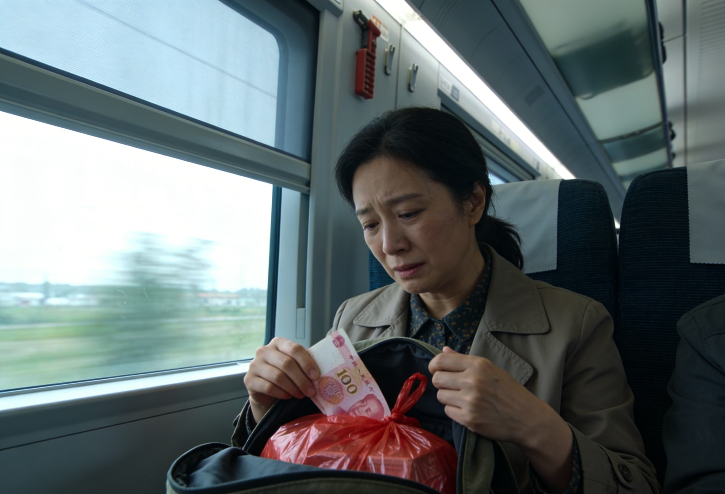 手指有点抖。我够下行李架上的双肩包,拉开拉链。几个廉价面包,塑料袋装着,压得有点扁。扒拉开,底下是个红塑料袋,捆得方正正,砖头似的。