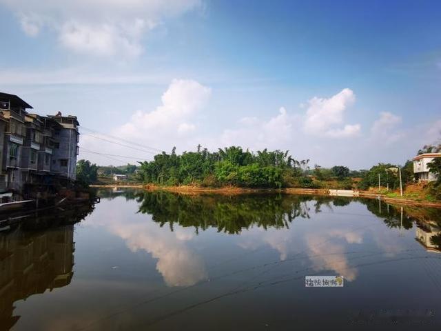 这个池塘的水域面积非常大,蓝天白云下的湖光山色格外美丽。