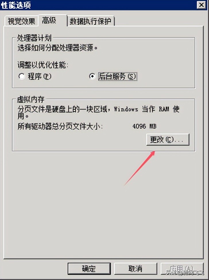 5)在“性能选项”窗口中,再次选择“高级”选项卡。点击“虚拟内存”部分的“更改”按钮。