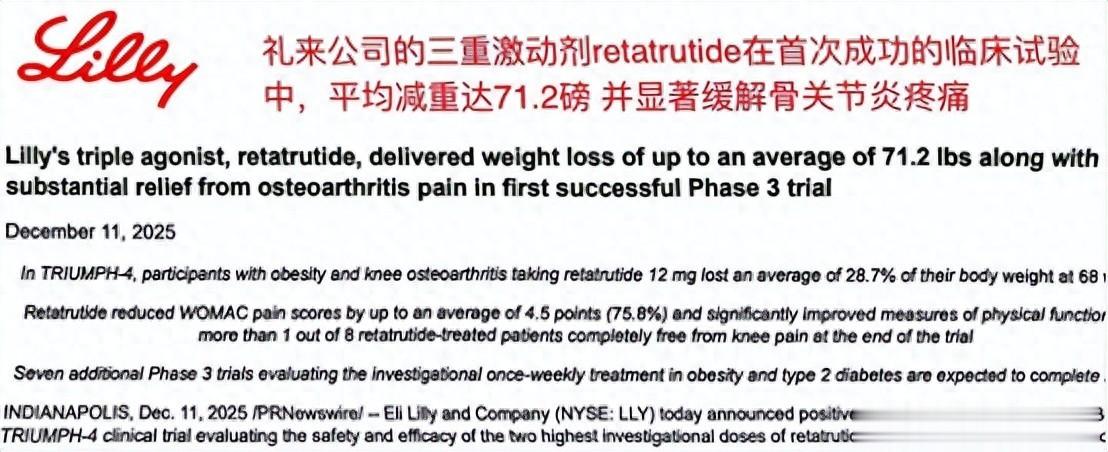 12月11日,医药巨头礼来宣布,其三重受体激动剂瑞他鲁肽(retatrutide)在三期临床试验中,取得了68周平均减重28.7% 的卓越数据。因其在减轻体重和缓解关节疼痛方面的双重潜力,该结果立即引发了健康领域的重点关注。