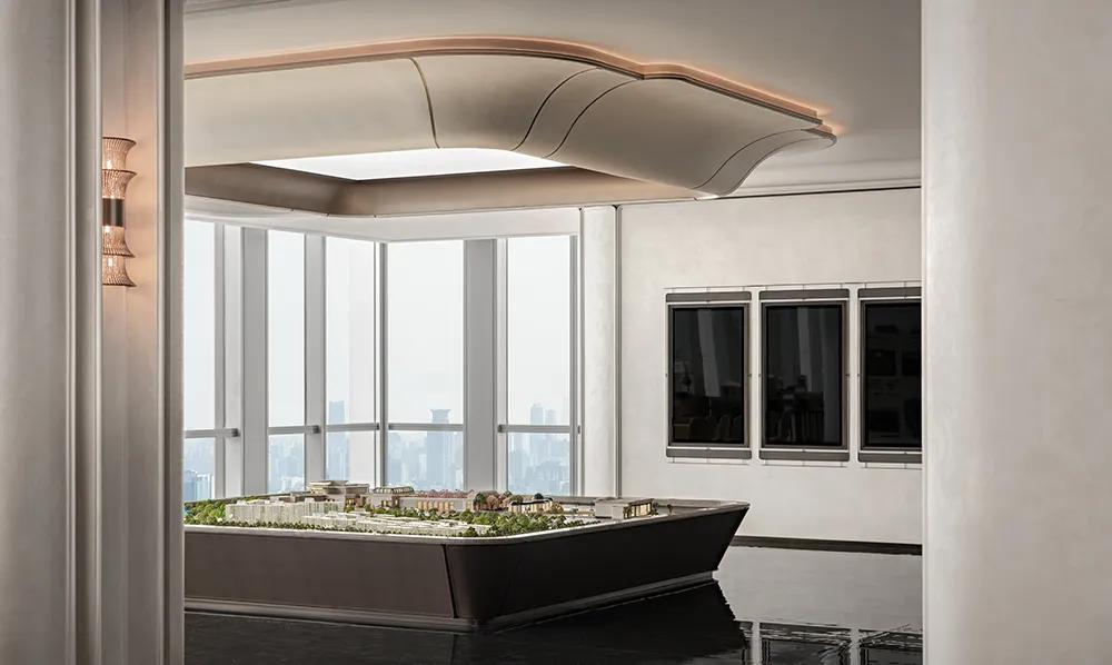 品牌展示区的墙面延续前厅韵律,顶部以白玉兰为意,丝绒艺术漆塑就立体花瓣肌理。中央透光灯膜借弄堂天井的光影哲思,灯亮时,一朵玉兰花便在天花悄然绽放。它与沙盘皮革花托虚实呼应,让空间主题在传统韵味与当代质感中落地,既藏精致肌理,又蕴文化底气。