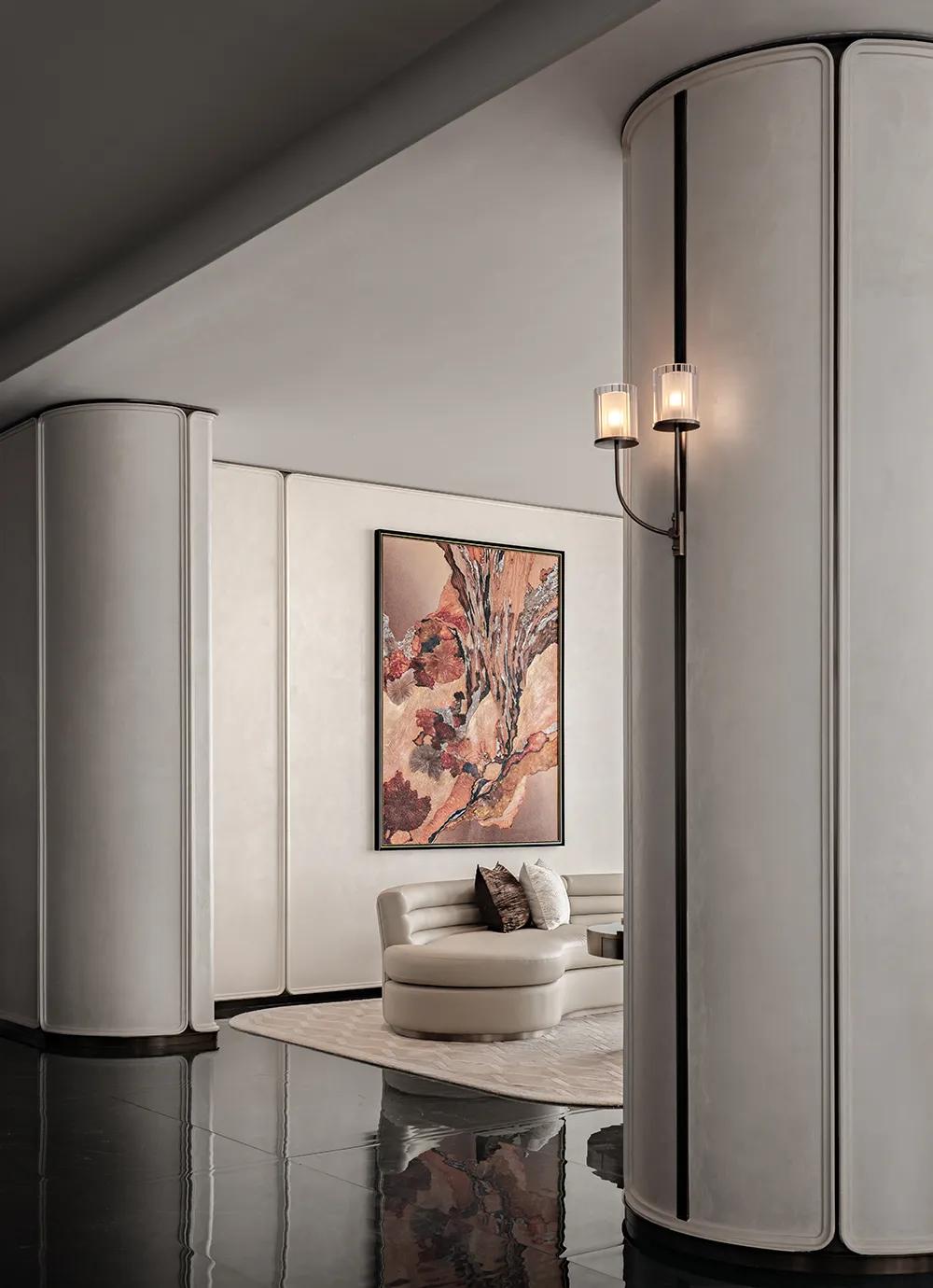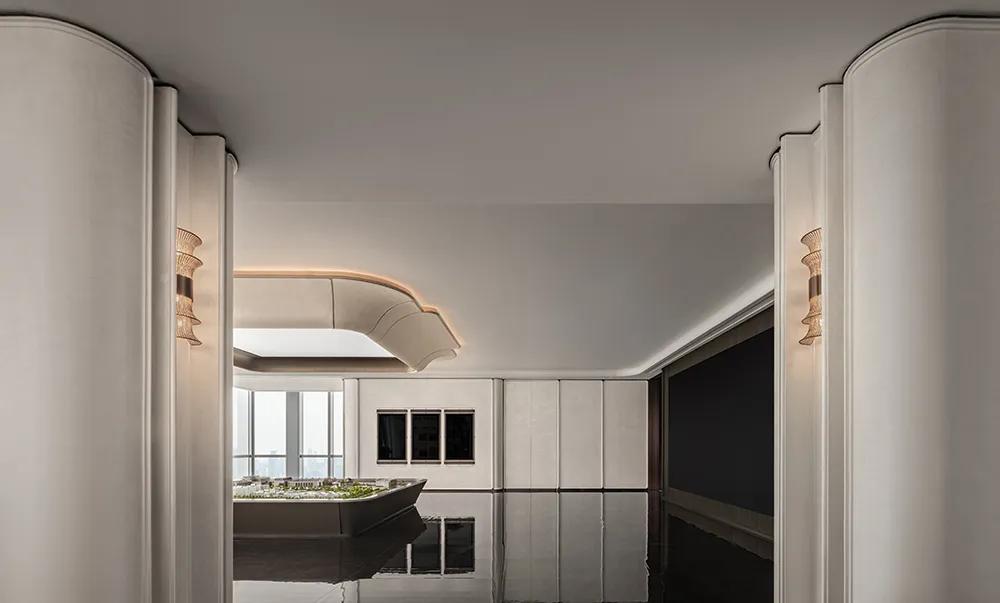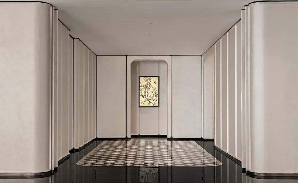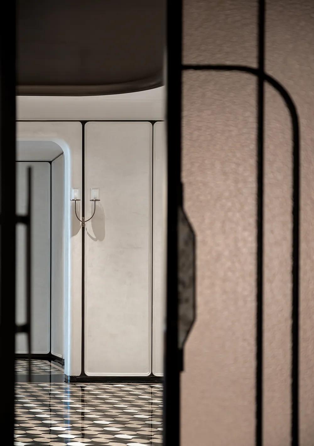 过厅空间以温润米色铺就基底,柔和且包容,间透着内敛高雅。萃取石库门建筑精髓,凝练成简洁流畅的线条符号,将经典轮廓融入空间肌理,让海派文脉与现代雅韵自然流转,相映成趣。