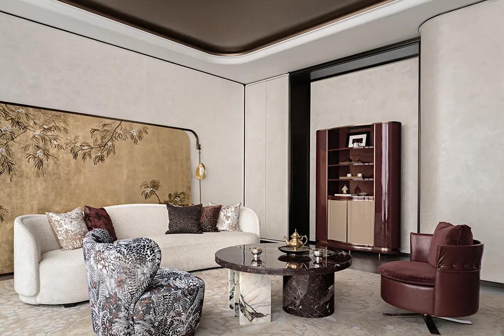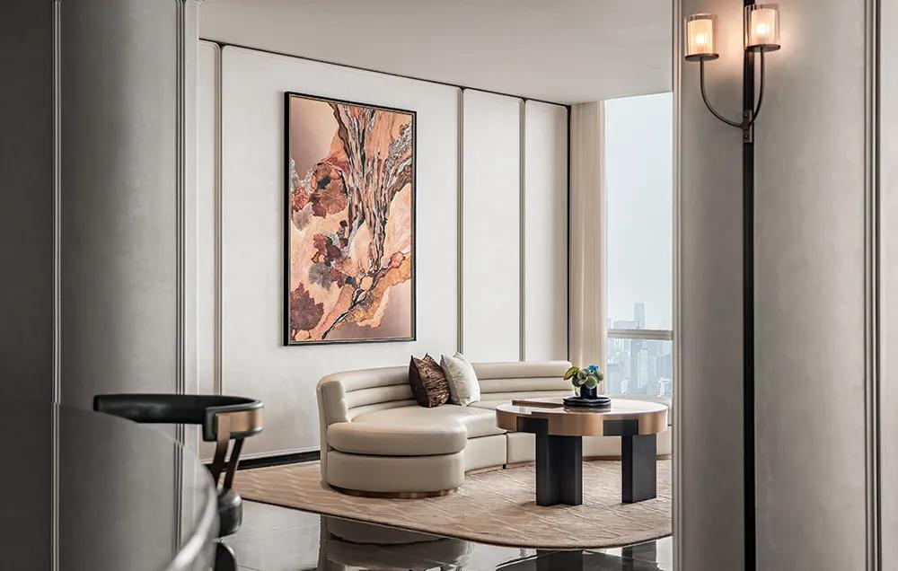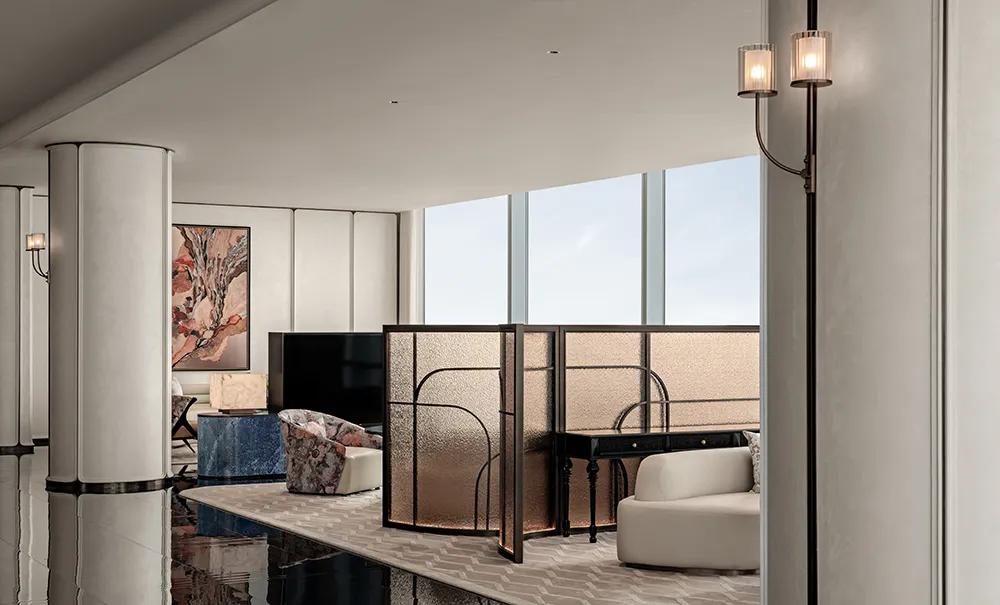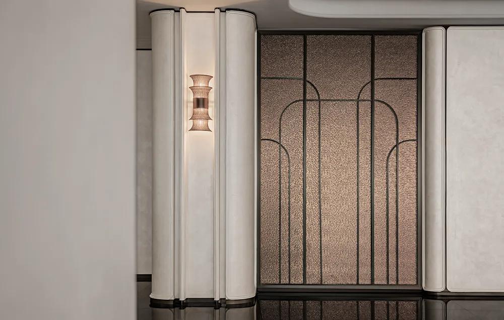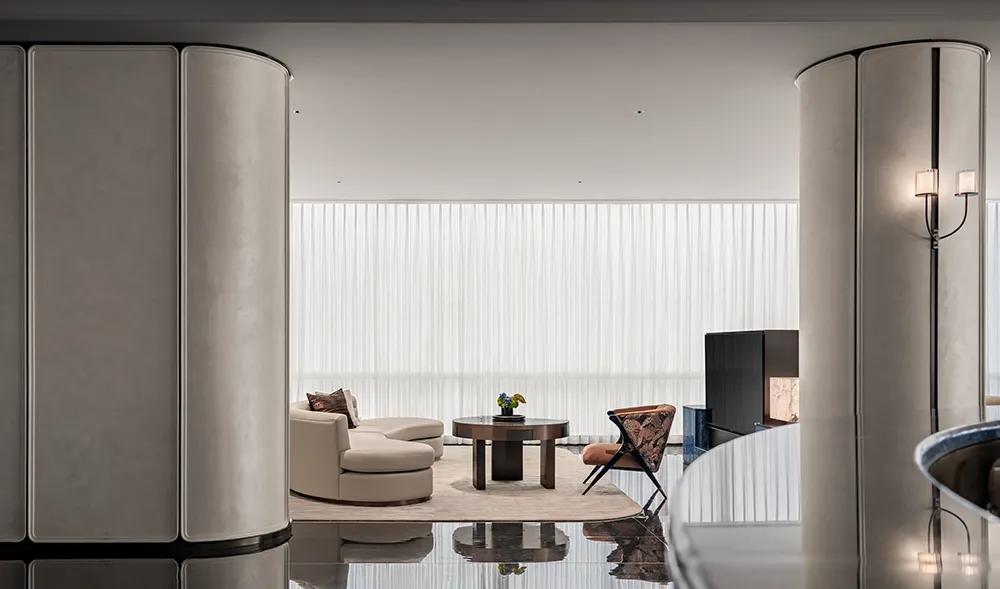 过厅空间以温润米色铺就基底,柔和且包容,间透着内敛高雅。萃取石库门建筑精髓,凝练成简洁流畅的线条符号,将经典轮廓融入空间肌理,让海派文脉与现代雅韵自然流转,相映成趣。