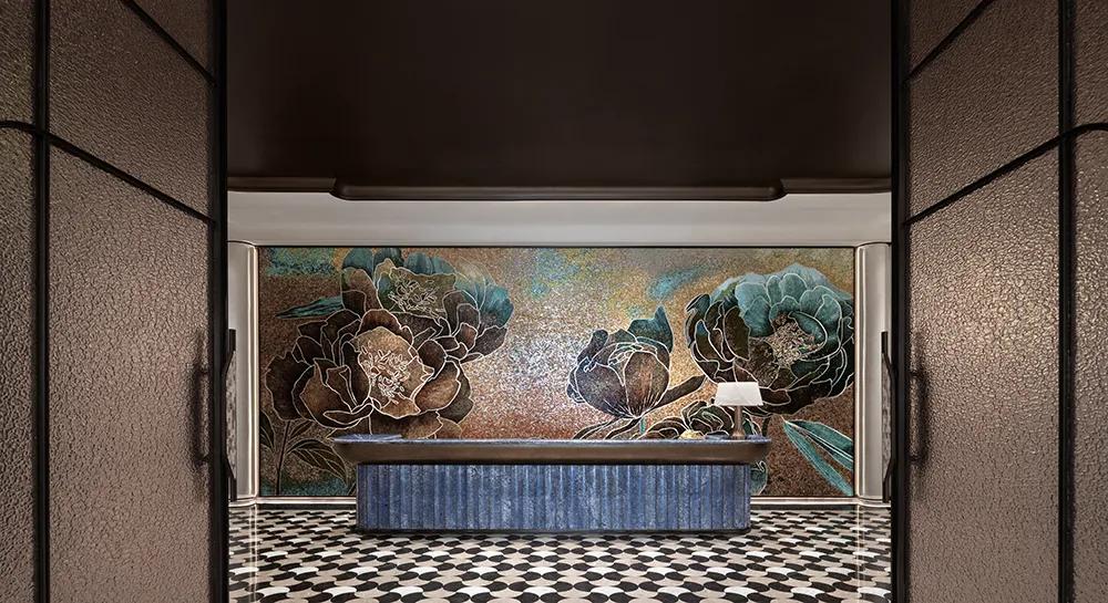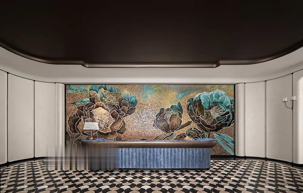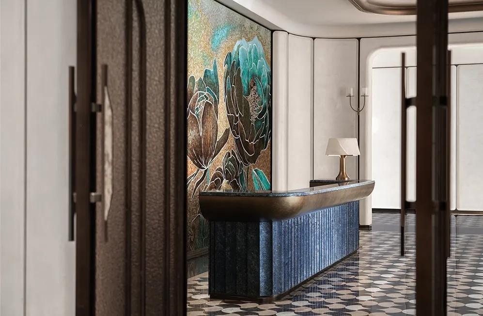 接待台甄选景泰蓝大理石,深邃底色缀金纹如星,藏纳内敛奢雅;背景以玉兰舒展流线为引,凝练城市文化印记,让海派意蕴与现代质感相融,自然强化空间辨识度与文化感染力。