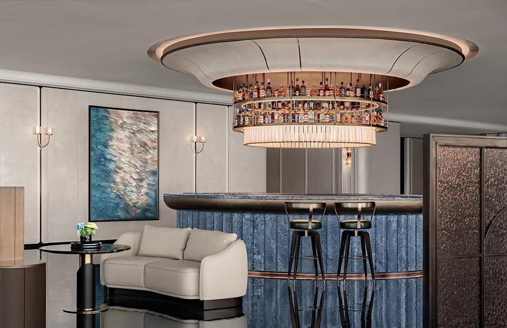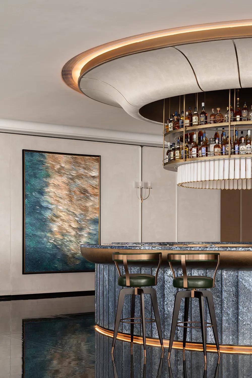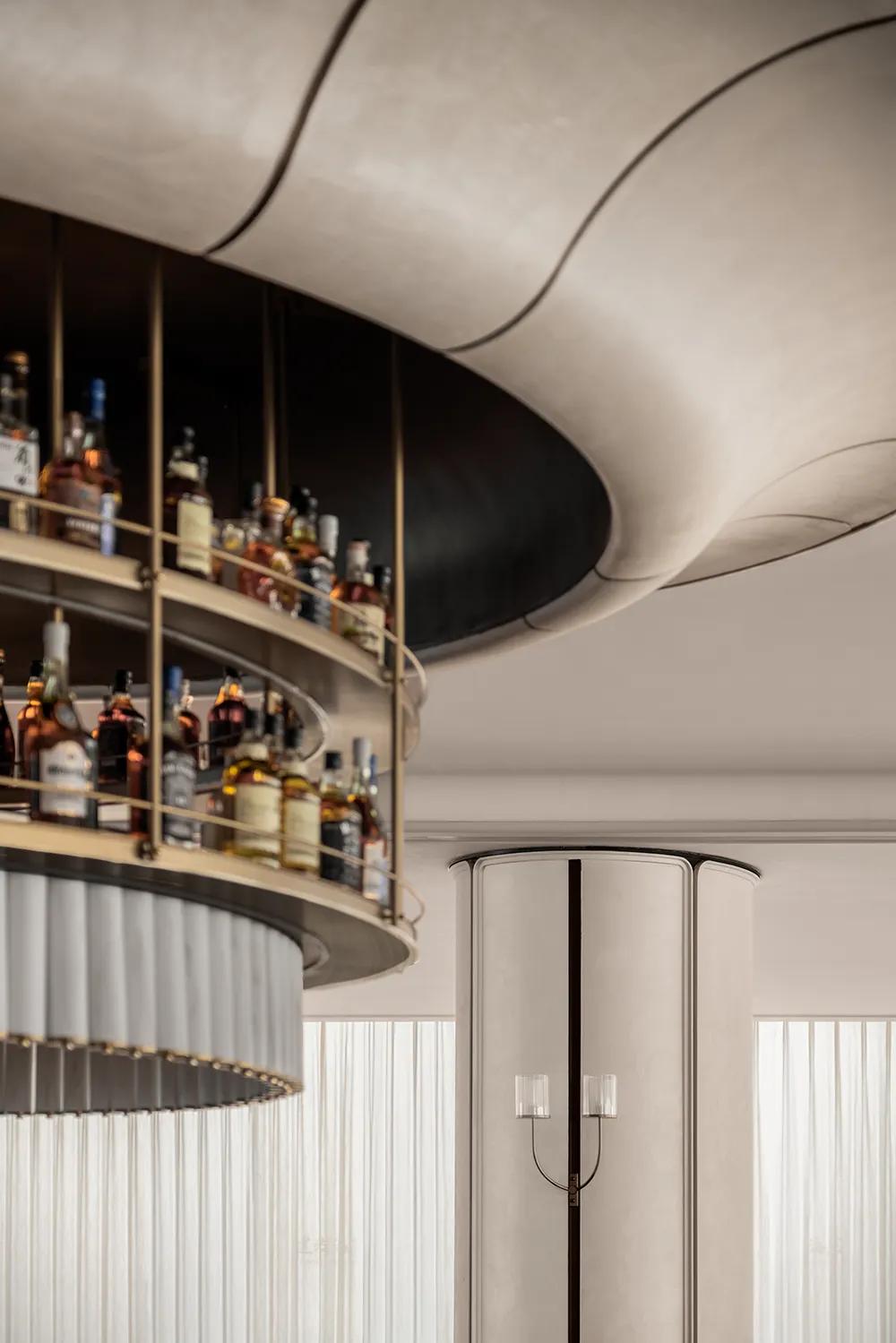 造型取白玉兰柔弧为意,金属漆面映光如星;中央金属吊架陈放杯饰,暗合虚实层次,与吧台金属元素相呼应,让海派的意蕴与雅致格调自然相融。