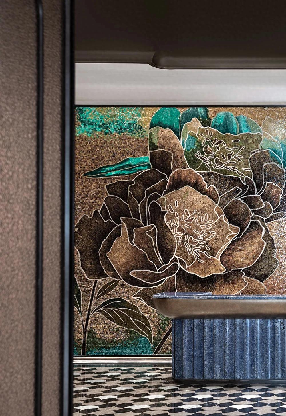 地面铺陈法国黑大理石,取玉兰花瓣意趣抽象为几何形拼花,借石材天然肌理与色泽差异勾勒层次。既成视觉焦点,又与天花玉兰造型虚实呼应,让空间主题在材质碰撞中自然深化。