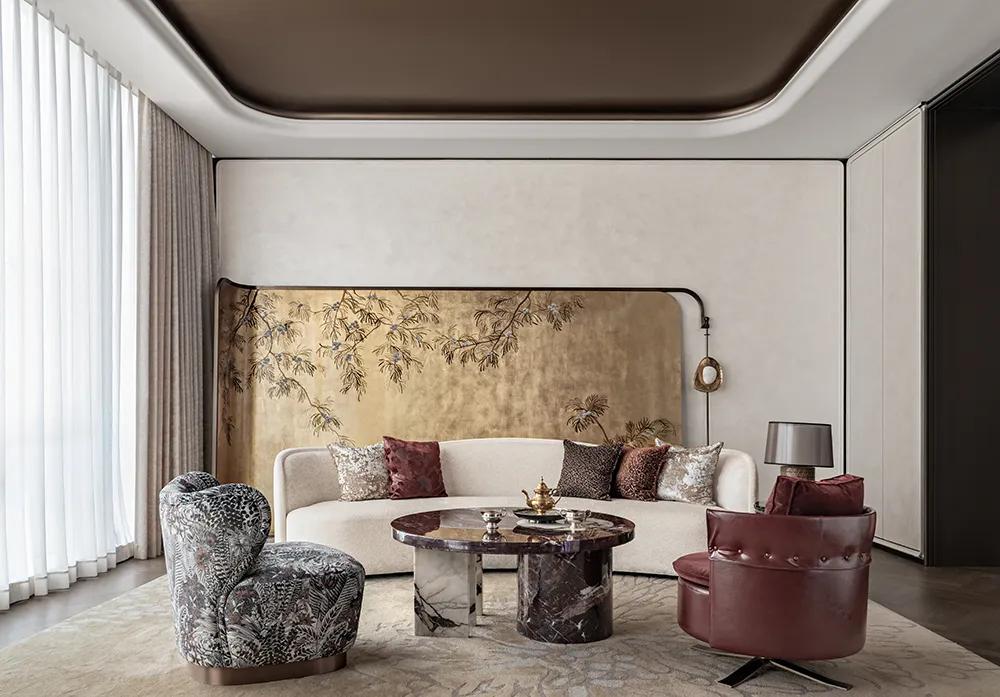 影音室以舒适观影、高端体验为核,围坐式沙发组与艺术化顶地墙,构筑沉浸式场域,提升空间质感与吸引力。深灰水纹暗纹地毯呼应新江湾,绒布硬包墙面以金属线条勾勒,声学与美学兼具;弧形灯槽吊顶柔化方正,让现代奢华与灵动气韵相融。
