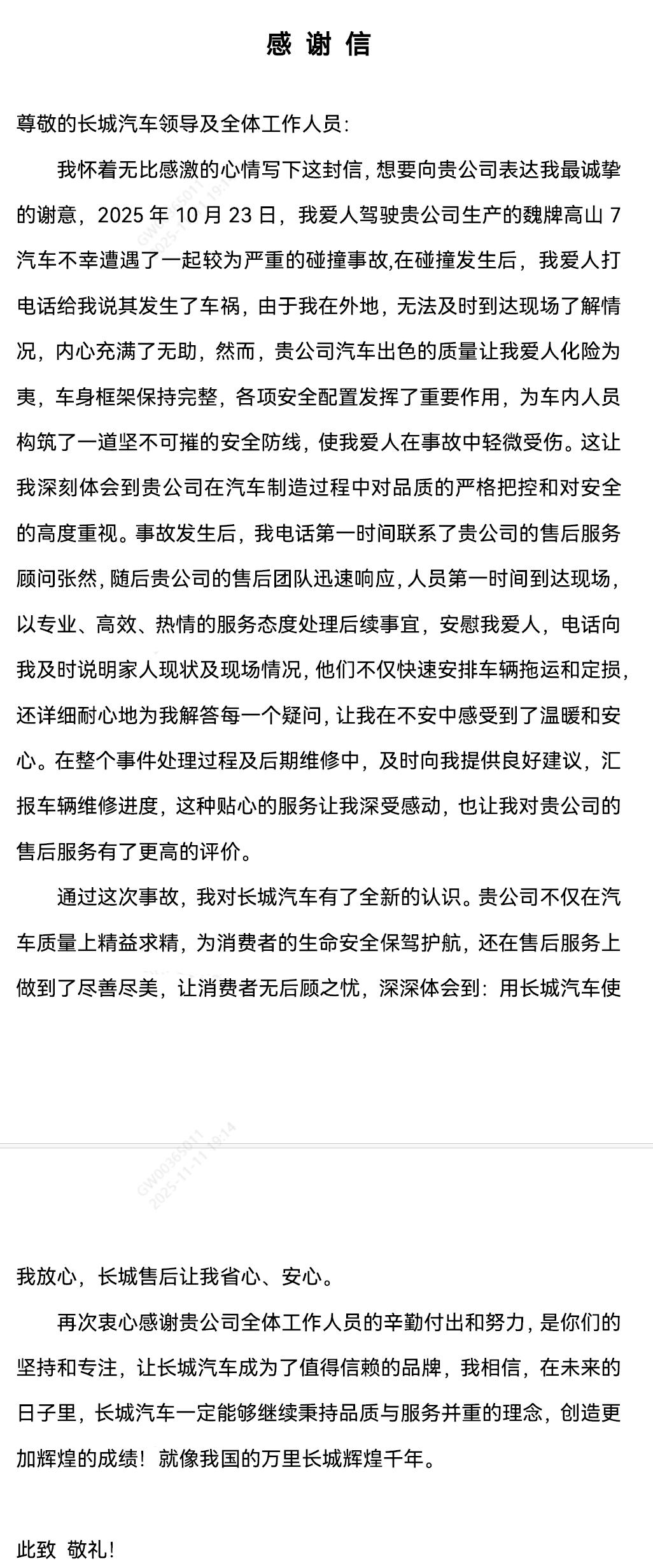 “贵公司汽车出色的质量让我爱人化险为夷,车身框架保持完整,各项安全配置发挥了重要作用,为车内人员构筑了一道坚不可摧的安全防线,使我爱人在事故中轻微受伤。这让我深刻体会到贵公司在汽车制造过程中对品质的严格把控和对安全的高度重视。”这是车主李先生,在感谢信中对产品安全性能的描述。