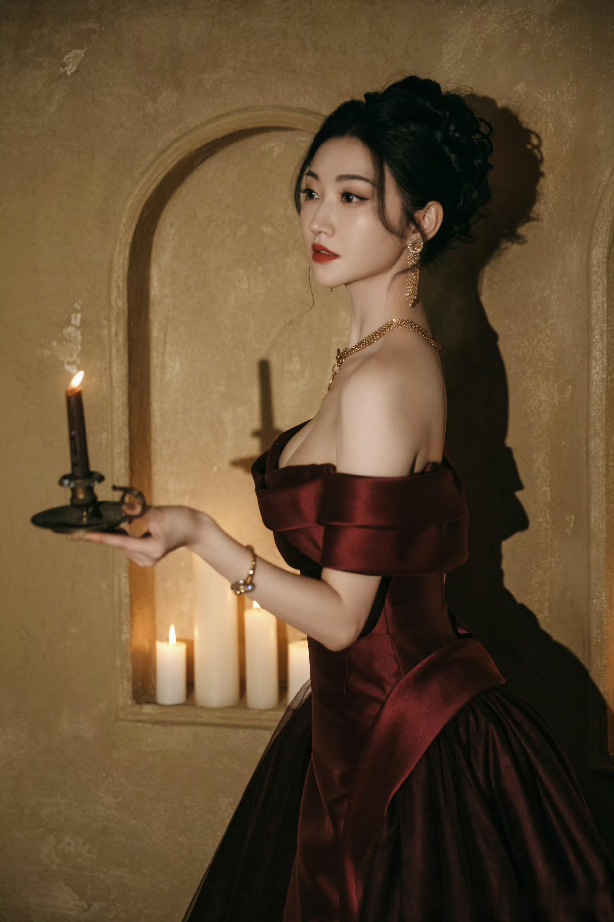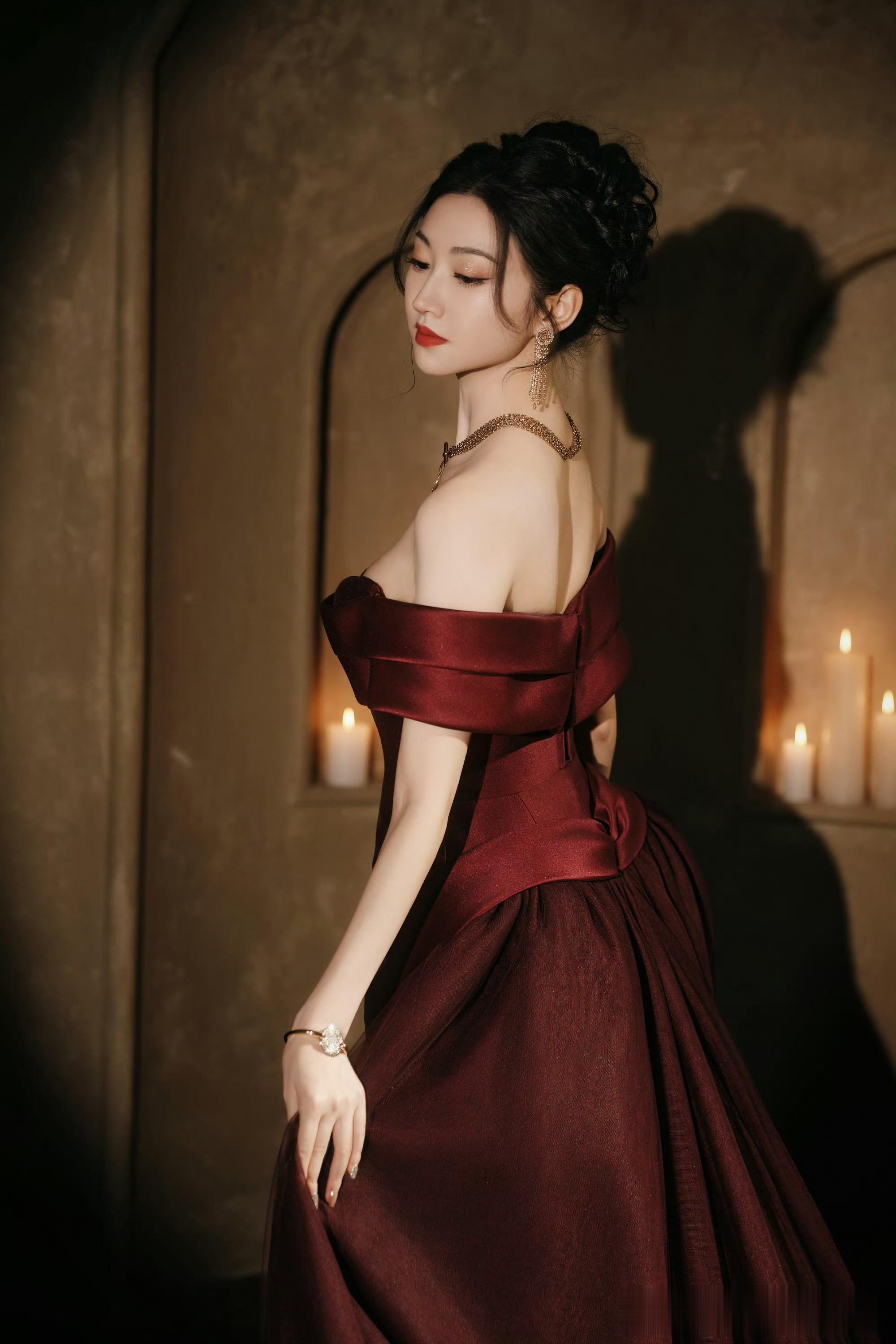 景甜这是什么复古名媛杀!💃酒红色露肩长裙+高盘发,一整个从旧时光里走出来