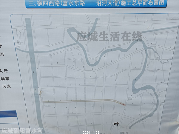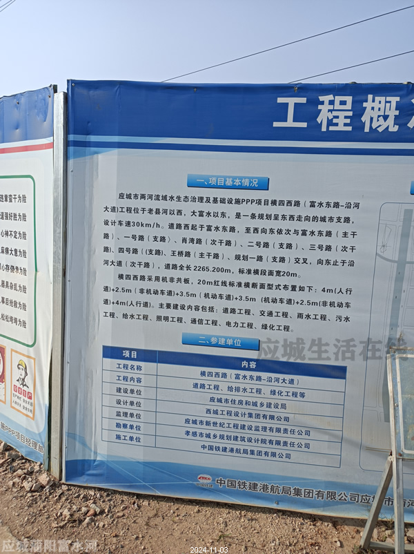 应城两河新区-横四西路启动建设,横四西路(富水东路-沿河大道)工程位于老县河以西,大富水以东,是一条规划呈东西走向的城市支路,设计车速30km/h。道路西起于富水东路,至西向东依次与富水东路(主干路)、一号路(支路)、肖湾路(次干路)、二号路(支路)、三号路(次干路)、四号路(支路)、王桥路(主干路)、规划一路(支路)交叉,向东止于沿河大道(次干路),道路全长 2265.2m,标准横段面宽20m。