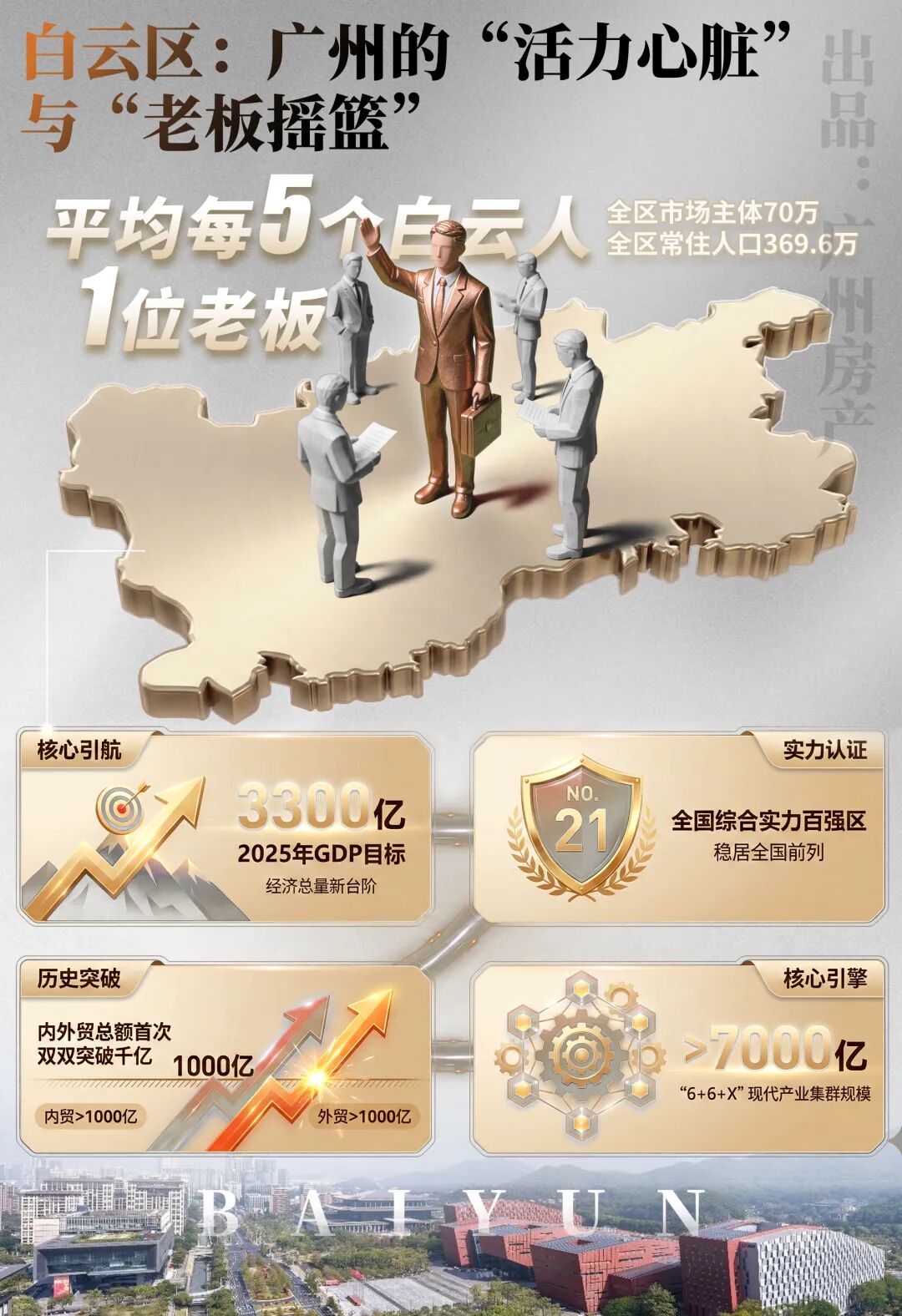 但真正让白云新城不可替代的,是其澎湃的内生动力。2025年,白云区GDP剑指3300亿,跻身全国综合实力百强区第21位,赛迪创新百强区第20位。“6+6+X”现代产业集群规模超7000亿元,内外贸总额首次双破千亿,发展锐不可当。这片土地最深厚的底色,就是其深厚的民营经济底色,与喷薄的企业家精神。十四五期间,这里净增24万户市场主体,相当于每天有超过130位新老板诞生。创业土壤之肥沃,全市罕见。如今,整个白云市场主体突破70万户,占全市1/6——算下来,平均每5个白云人里(369.6万常住人口),就有1位是老板。正是这成千上万的“蚂蚁雄兵”,把白云区托上了全市经济的第一梯队。