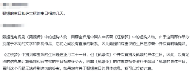 再比如文学作品人物生日的计算难题。问:甄嬛和薛宝钗的生日间隔多久呢?这个问题可不简单,涉及不同的文学作品,还得算农历,好多 AI 遇到这种问题容易出错,就像下面这样。