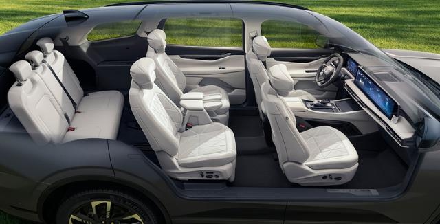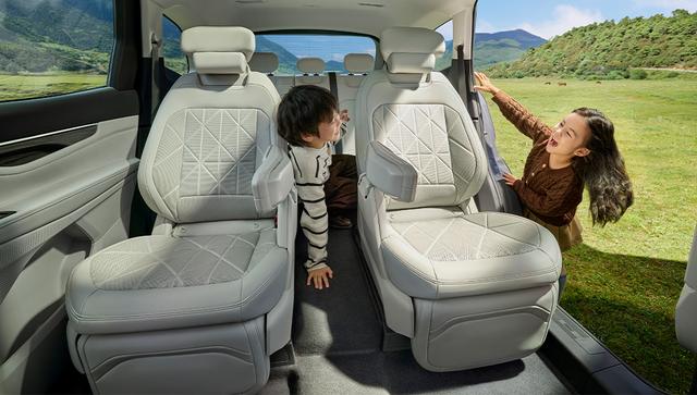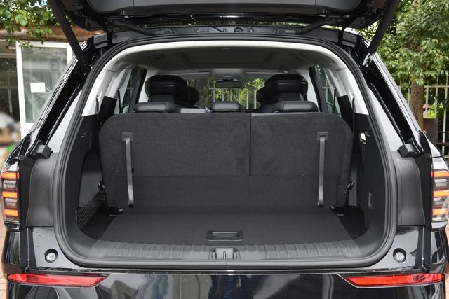 后备箱空间同样让人惊喜,数据显示,三排座椅全部坐满时,后备箱容积为309L,我目测能轻松塞进两三个登机箱,满足全家长途出行的行李存放需求;把第三排座椅放倒,容积扩大到969L,露营装备、婴儿车、大件玩具都能轻松装下;如果再把第二排座椅放倒,后备箱容积可达到2876L,形成一个平坦的超大空间,搬家拉大件物品也完全够用,实用性满满,适配家庭各种出行场景。