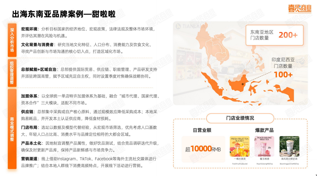 以甜啦啦出海印尼为例,该品牌采用“总部统筹+区域自营+城市代理”的管理架构,通过集中采购核心原料、本地采购易消耗品来降低供应链成本;印尼单国门店突破百家,东南亚区域总量超过200家,单店日营收超万元人民币。