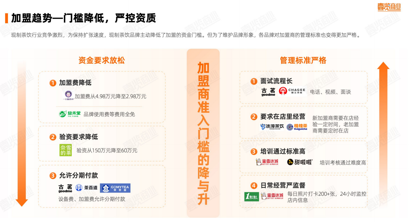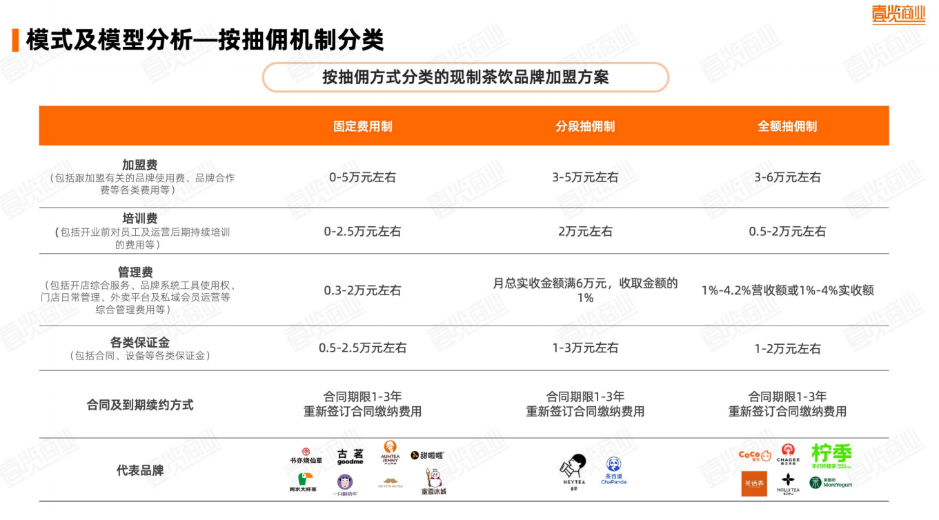 从商业模式看,现制茶饮行业目前以加盟模式为主,部分品牌直营和加盟模式并行,中小品牌一般先以直营完成商业模式验证后开启扩张。而在加盟模式中,按抽佣机制可以分成固定费用制、分段抽佣制和全额抽佣制三类。