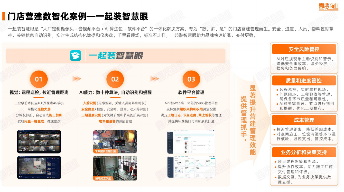 在视觉层,安装的高清摄像头可实时采集施工现场影像,解决品牌总部与施工现场之间的信息不对称问题;在AI层,系统可自动识别人员、物料、设备、进度等关键节点,识别安全隐患并生成预警,确保施工过程标准化、可追溯;在软件平台层,所有信息被自动汇总到SaaS管理系统中,形成可视化看板,用于工期监控、质量评估与成本分析。