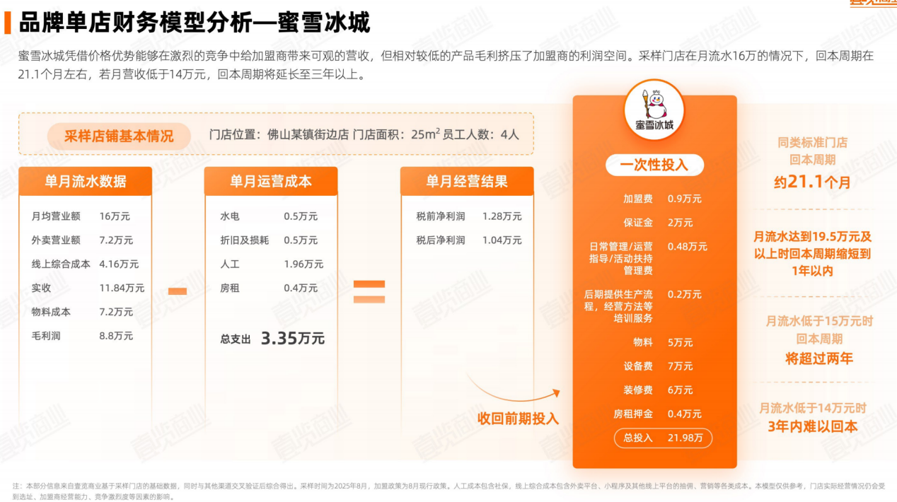 而蜜雪冰城,凭借价格优势能够在激烈的竞争中给加盟商带来可观的营收,但相对较低的产品毛利挤压了加盟商的利润空间。采样门店在月流水16万的情况下,回本周期在21.1个月左右,若月营收低于14万元,回本周期将延长至三年以上。
