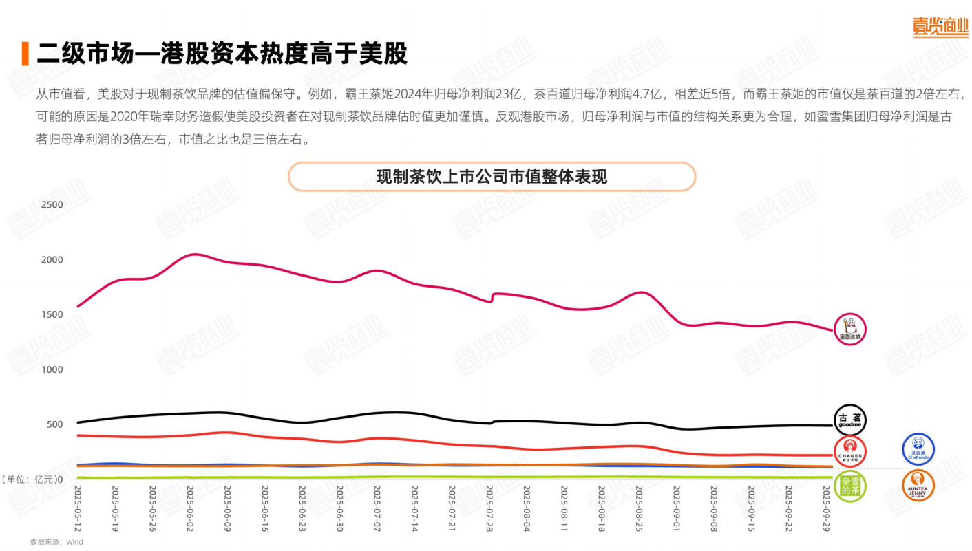 港股成为现制茶饮品牌上市的主要阵地,资本关注度明显高于美股。无论是从市值体量还是盈利结构来看,蜜雪冰城已独立成档,其市值和营收均远超其他品牌;古茗与霸王茶姬形成第二梯队,具备稳定增长与盈利能力;茶百道、沪上阿姨、奈雪的茶则位于第三梯队,市值分化明显。