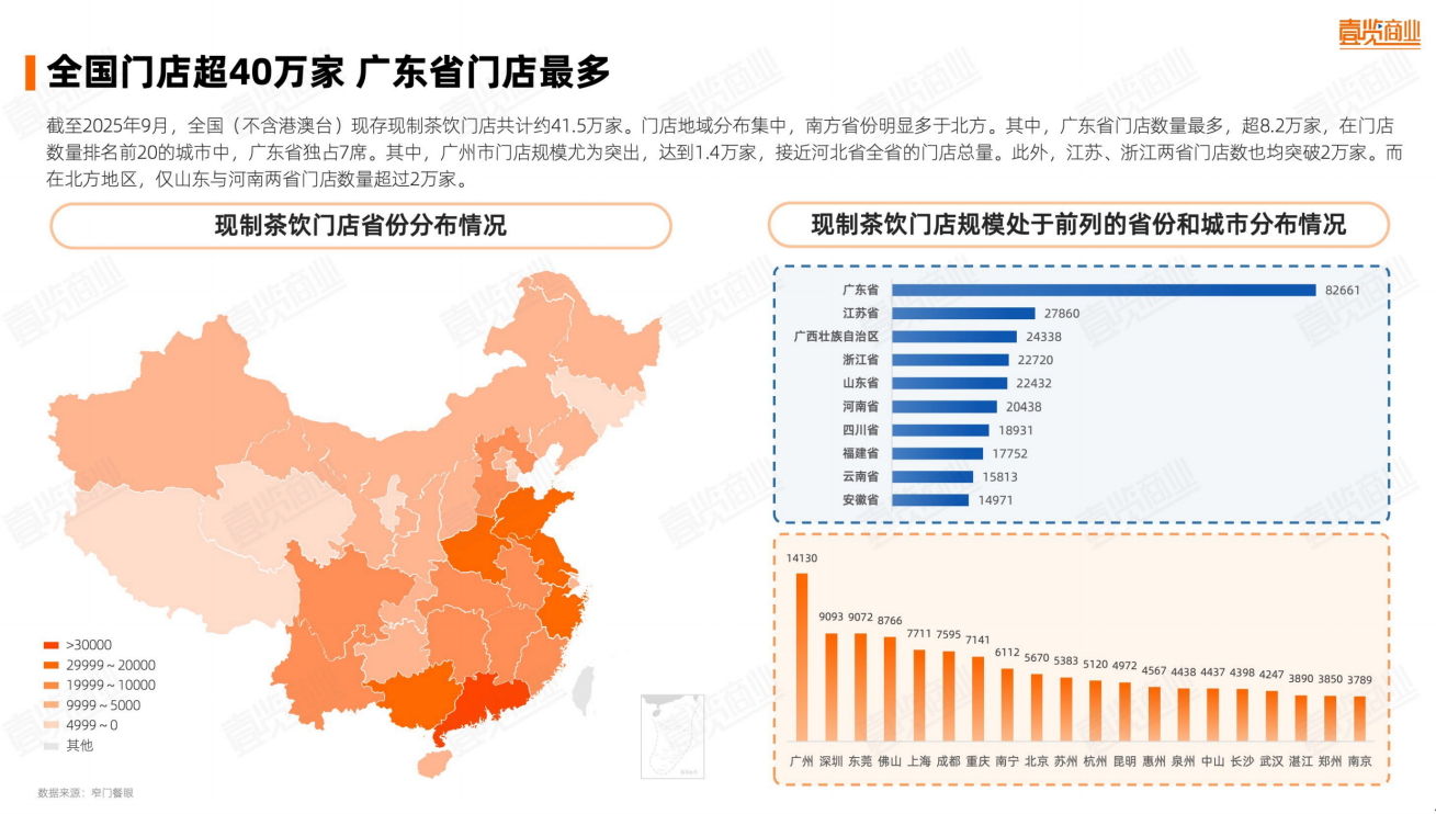 从区域视角看,截至2025年9月,全国(不含港澳台)现制茶饮门店总量已突破41.5万家,行业规模持续扩大,但区域分布极不均衡。整体呈现出“南多北少、东强西弱”的格局,其中广东省以超8.2万家门店位居全国首位,仅广州市一地就拥有超过1.4万家门店,接近整个河北省的总量。江苏、浙江、山东、四川等省紧随其后,均突破2万家门店大关。