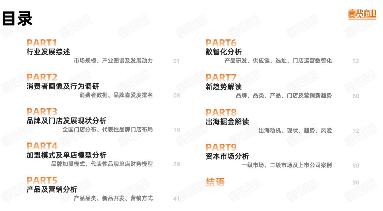 《报告》总体分为八个部分,分别从行业、消费者、品牌及门店、加盟、产品、营销、数字化、资本市场及2025新趋势等10个方向全面解读2025现制茶饮行业。
