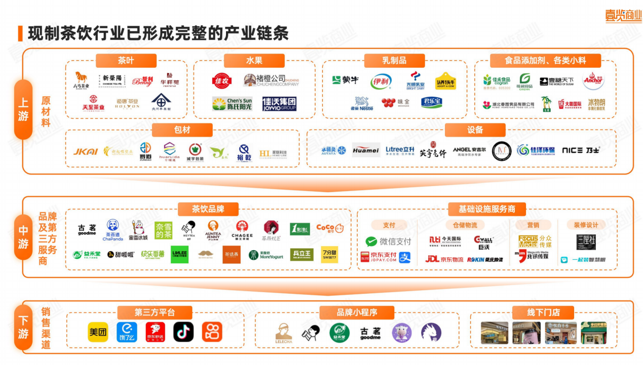 这一变化背后,是茶饮产业链的成熟与竞争格局的固化。上游从原料到设备形成了完整生态:茶叶、水果、乳制品、包材、添加剂等环节均已高度专业化,涌现出天圣有机、佳农、伊利、安琪酵母等稳定供应商体系;中游则由品牌及第三方服务商构成核心增长引擎,品牌矩阵基本成型;下游渠道以美团、饿了么、小红书、抖音等多元平台为主,线上化、数字化程度快速提升。