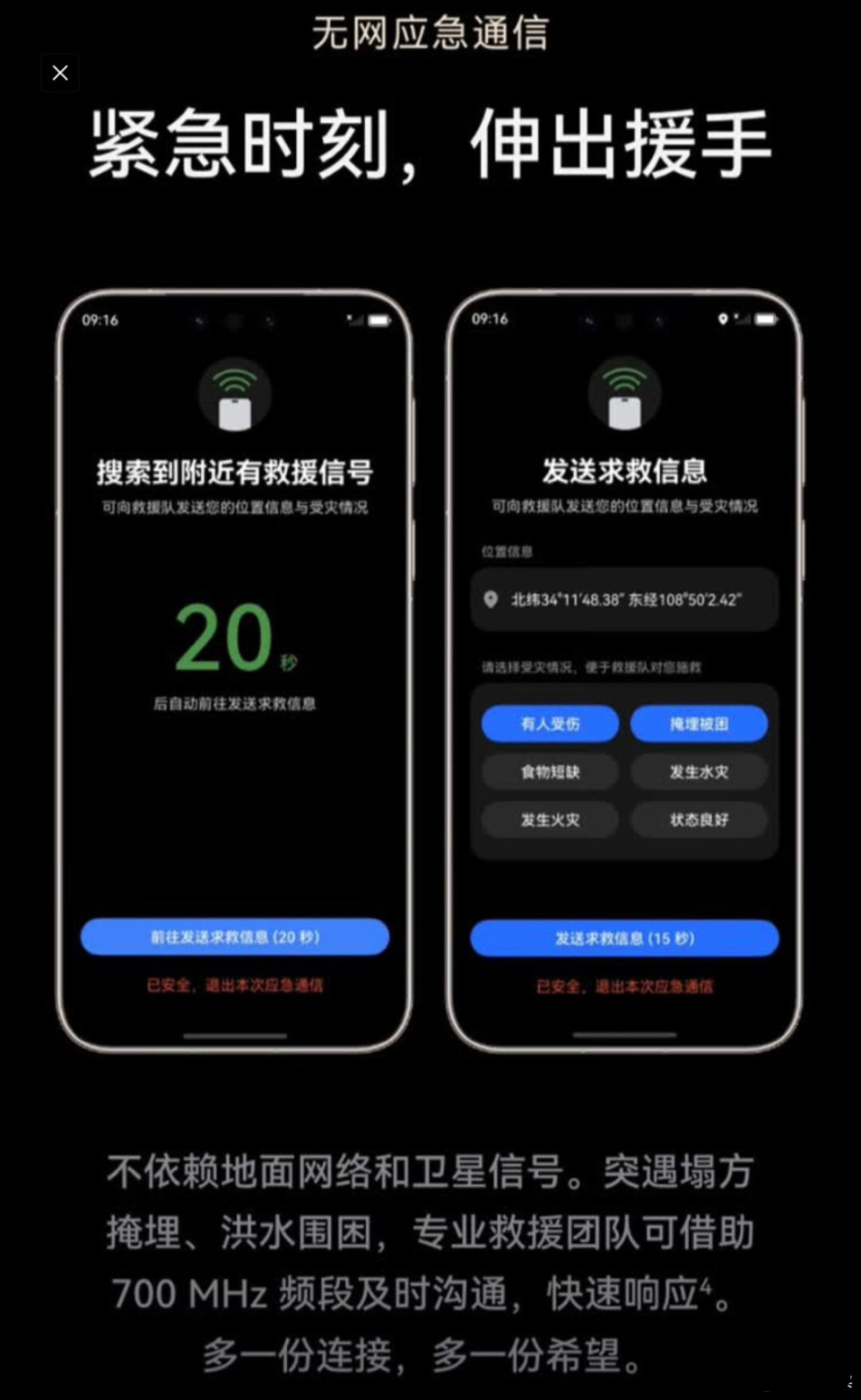不仅支持卫星通信,此次该机还在业界首发了“无网应急通信”功能。该功能利用700MHz低频频段无线电波强大的穿透和远距离传输特性,能够在地面网络完全瘫痪的灾害或救援场景下,实现最远13公里、并可穿透三堵墙的通信连接,在城市灾害、户外救援等场景堪称关键时刻的“救命”神器,为紧急情况增添了一份宝贵的希望。