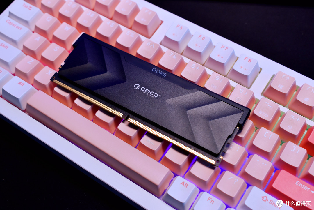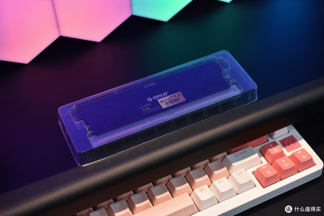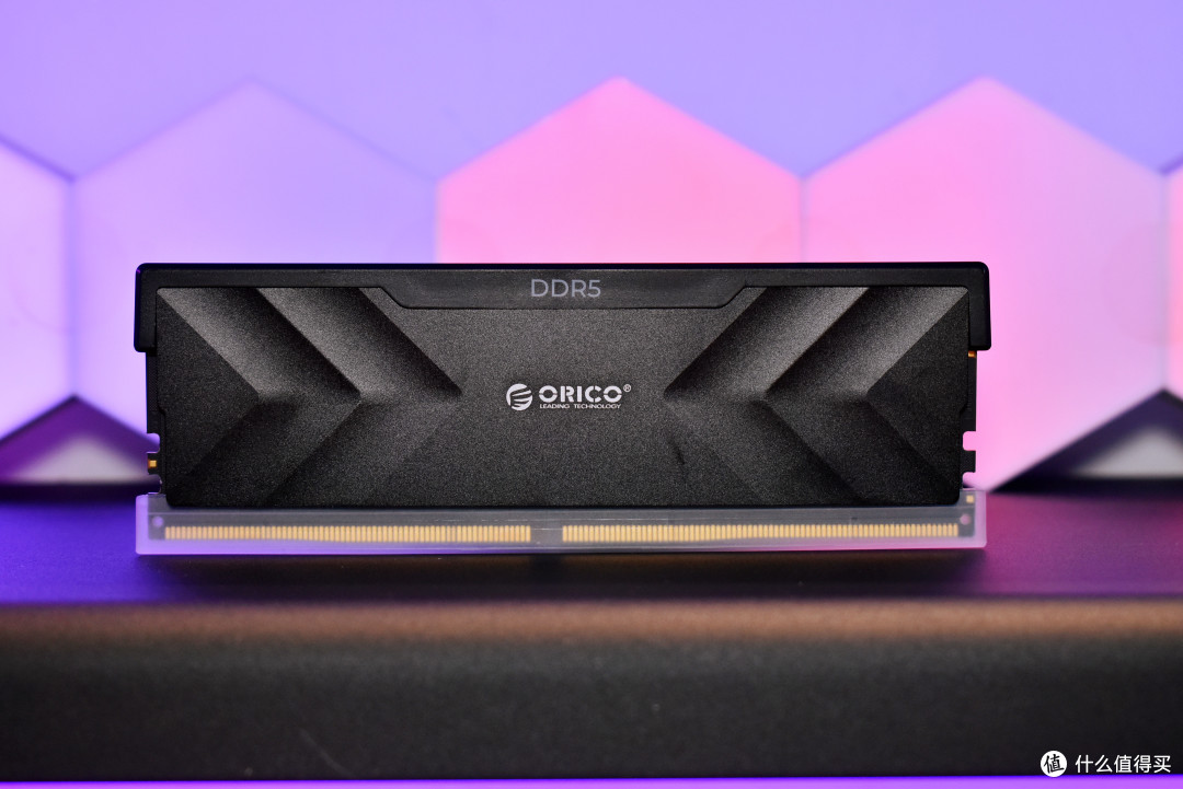内存条外观有黑色和银白两种颜色可选,我选择的银黑色款在灯光下有着细腻的磨砂质感。其铝合金材质的马甲设计独特,两侧凹陷三角形指引至中央的 “ORICO” 标识,机甲风十足,科技感拉满。