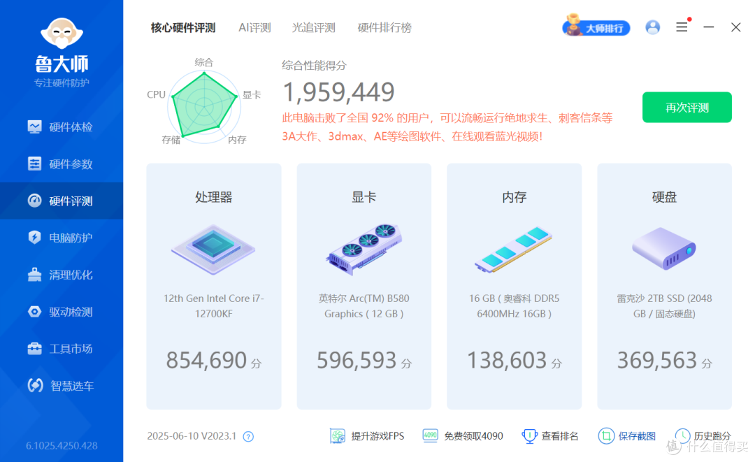 通过鲁大师的核心硬件评测结果来看,内存条在不同频率下,测试得分上也会有较为明显的差异,这款内存条在4800MHz默认频率下,电脑综合性能得分为1959449,其中内存的得分为138603。