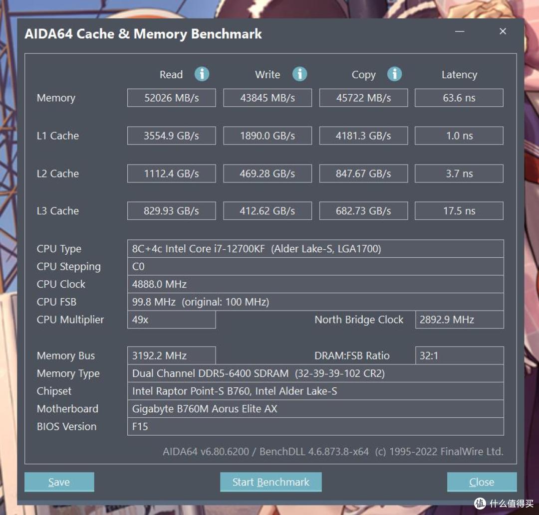 通过主板BIOS菜单一键开启XMP,内存的频率瞬间提升为6400MHz,时序为32-39-39-102,性能表现自然也是全面提升啦。其中读取速度达到了52026MB/s,写入速度为43845MB/s,复制速度为45722MB/s,延迟降到了73ns。这款内存在读取、写入还是延迟,综合对比整体性能均是直线上升。