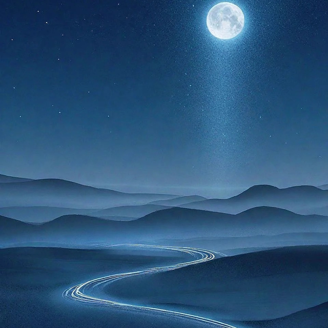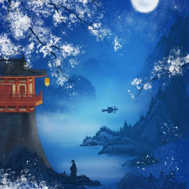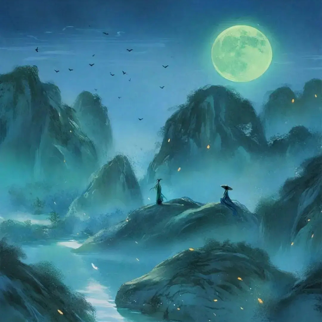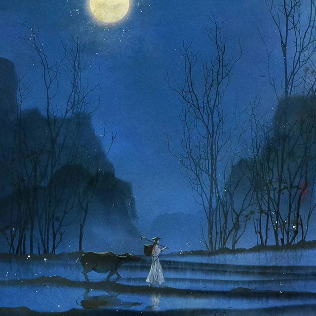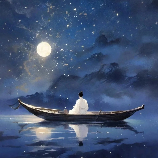 漫漫长夜,独自起身,却见璀璨的星辰与皎洁的明月,一同洒满了空旷的江面。江水在星月的光辉下,显得格外宁静而神秘,也映照出旅人的孤寂与思绪。