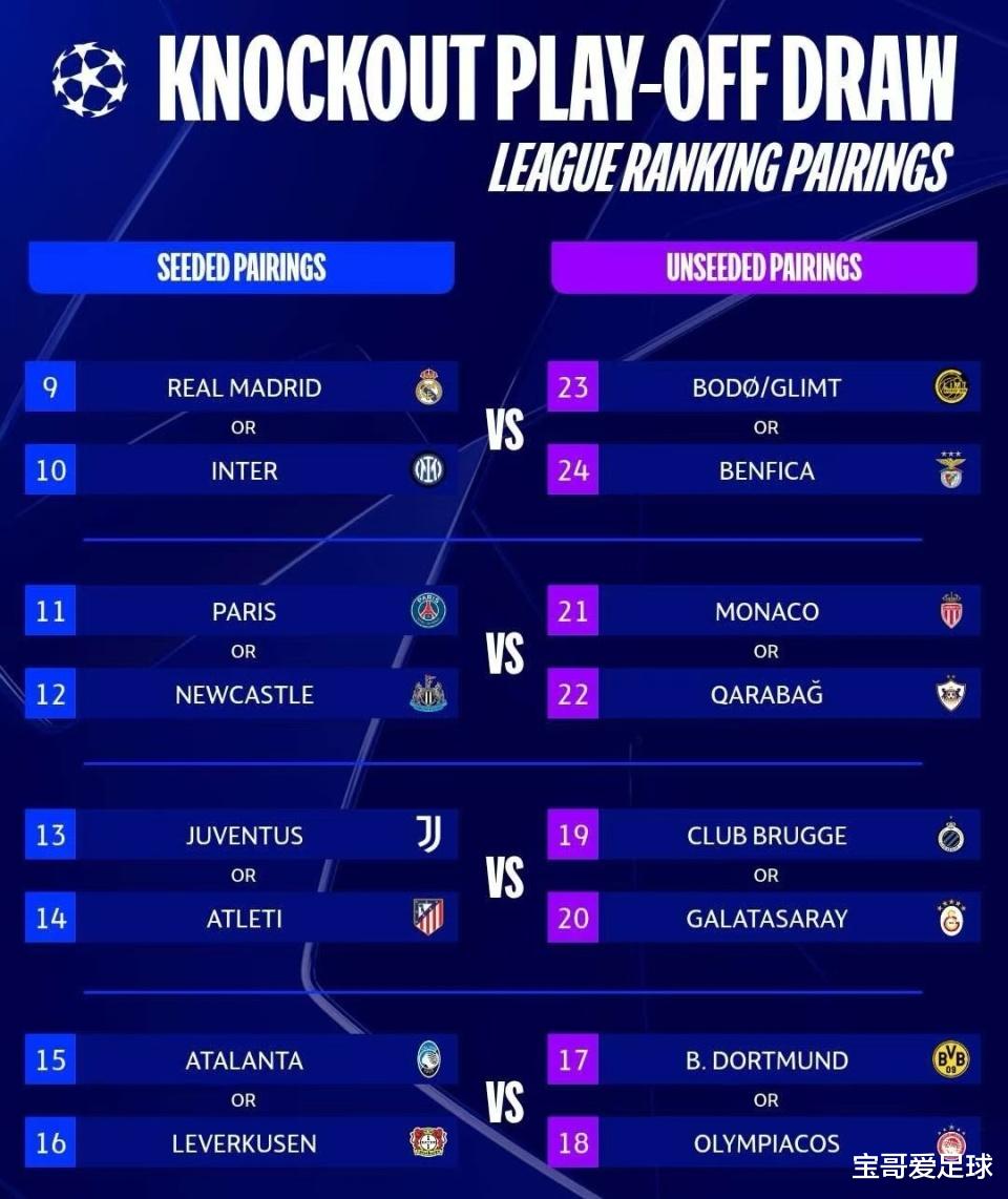 第9名皇马、第10名国米、第23名博德闪耀和第24名本菲卡将会通过抽签捉对厮杀,其中皇马和国米是种子队,也就是本菲卡肯定会遇到这两支球队中的一支,对于本菲卡主帅来说,皇马和国米都是他的前东家,这两支球队的不少球迷同时还都是穆里尼奥最坚定的支持者。虽然从理论上来看,本菲卡抽到皇马和国米的概率是一样的,但以欧足联的尿性来看,本菲卡抽到皇马的概率高达90%。
