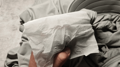 使用小风扇选择最低档风力,隔着衣服测试透气情况,开启风扇之后,衣服下方的风扇轻松吹起了这张卫生纸,透气效果很棒。