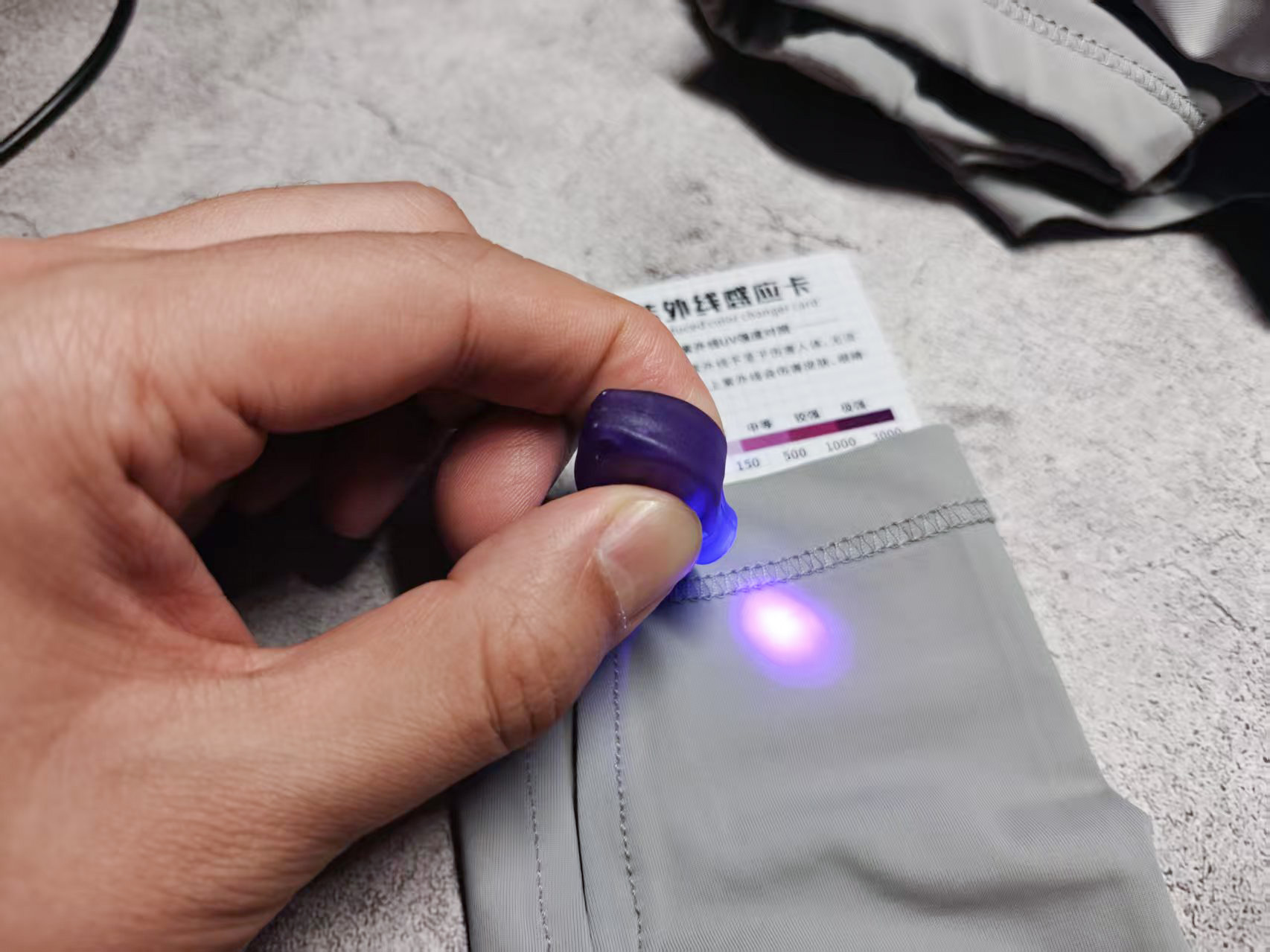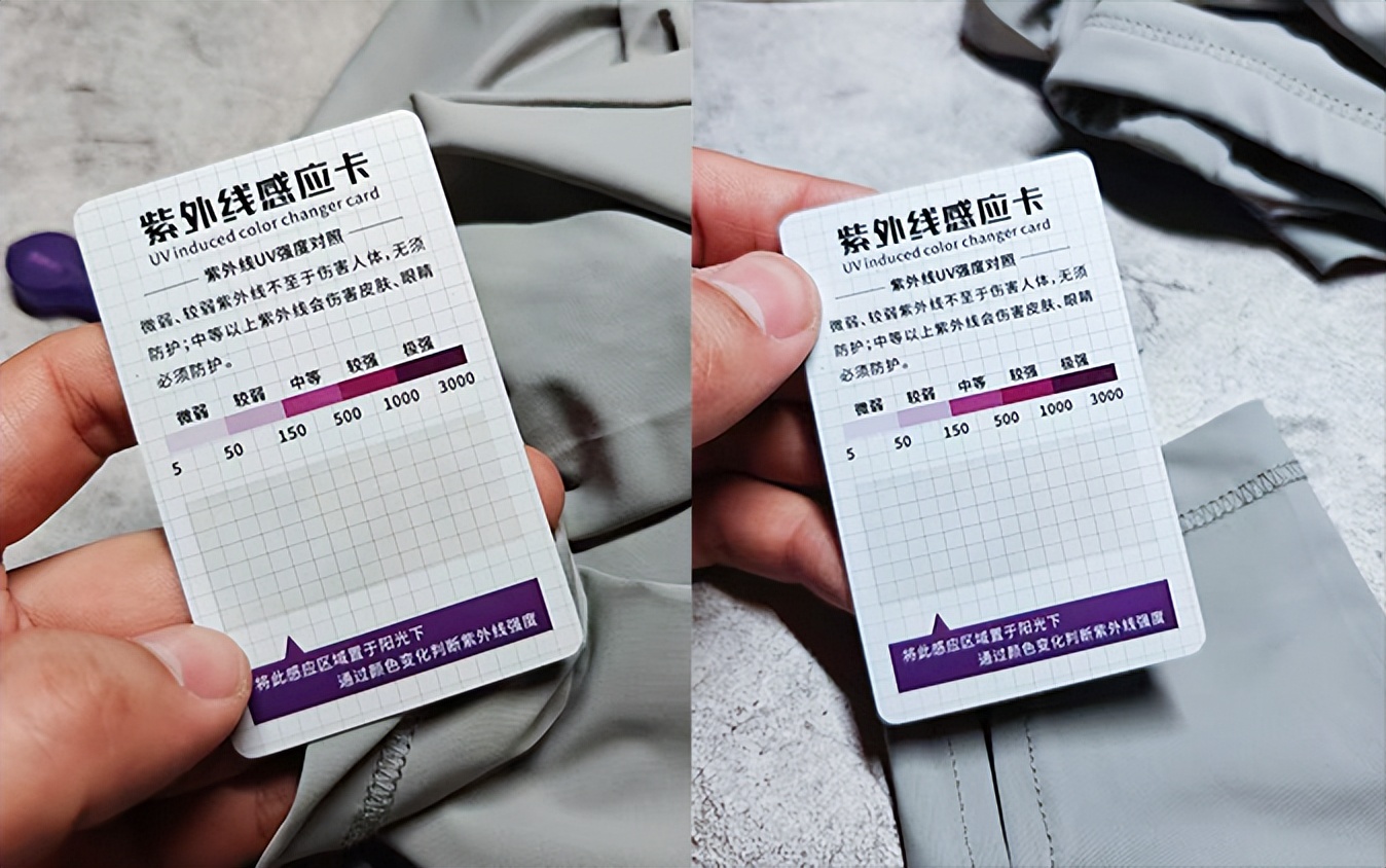 使用紫外线灯隔着防晒衣照射到紫外线感应卡,紫外线能够完全被这件防晒衣隔绝开来,紫外线卡上不会有任何紫外线照射过的痕迹,这就是高原级防晒的厉害。