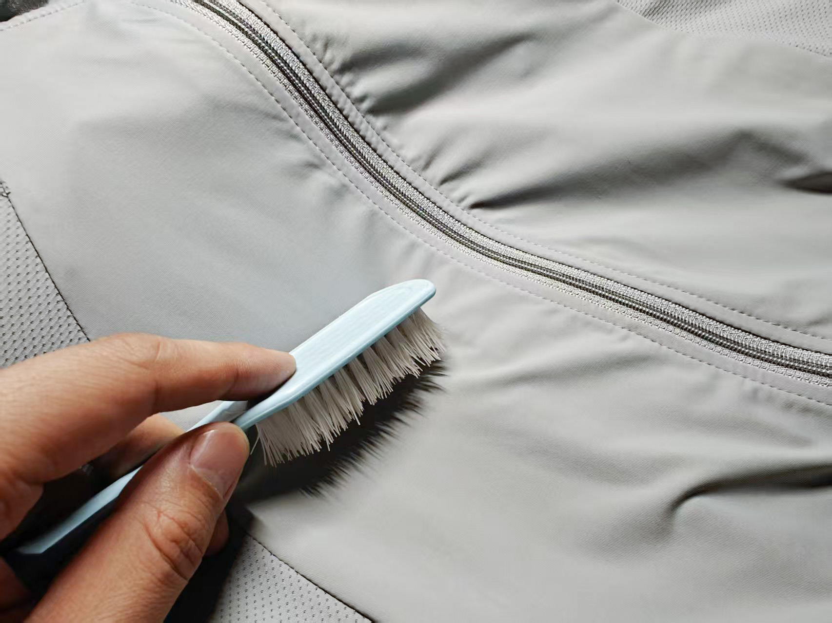 另外,防晒衣面料有着4级抗勾丝的能力,日常穿着即便与尖锐小物“狭路相逢”,也不会轻易留下勾丝痕迹,让你时刻都能自信满满地穿着它,无惧日常小意外。实际使用刷子反复摩擦,缺失没有一点勾丝情况出现。
