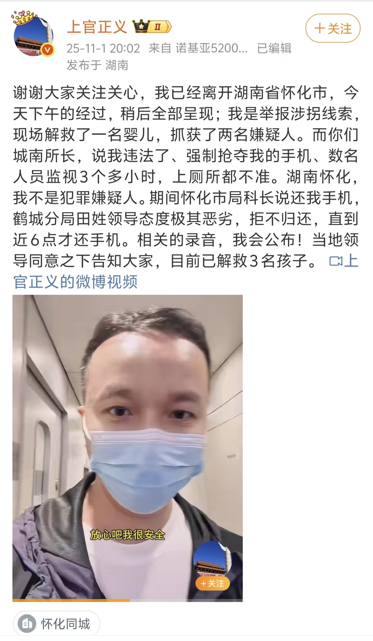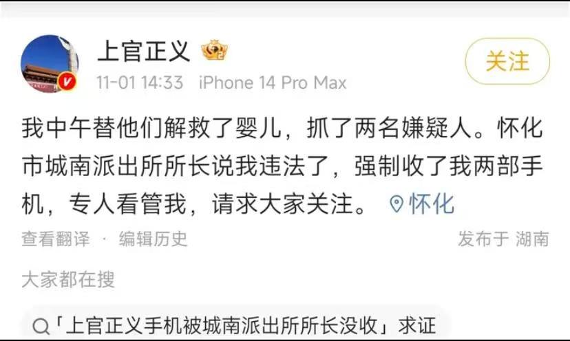 上官正义在发帖中写道:“我中午替他们解救了婴儿,抓了两名嫌疑人。怀化市城南派出所所长说我违法了,强制收了我两部手机,(派)专人看管我。