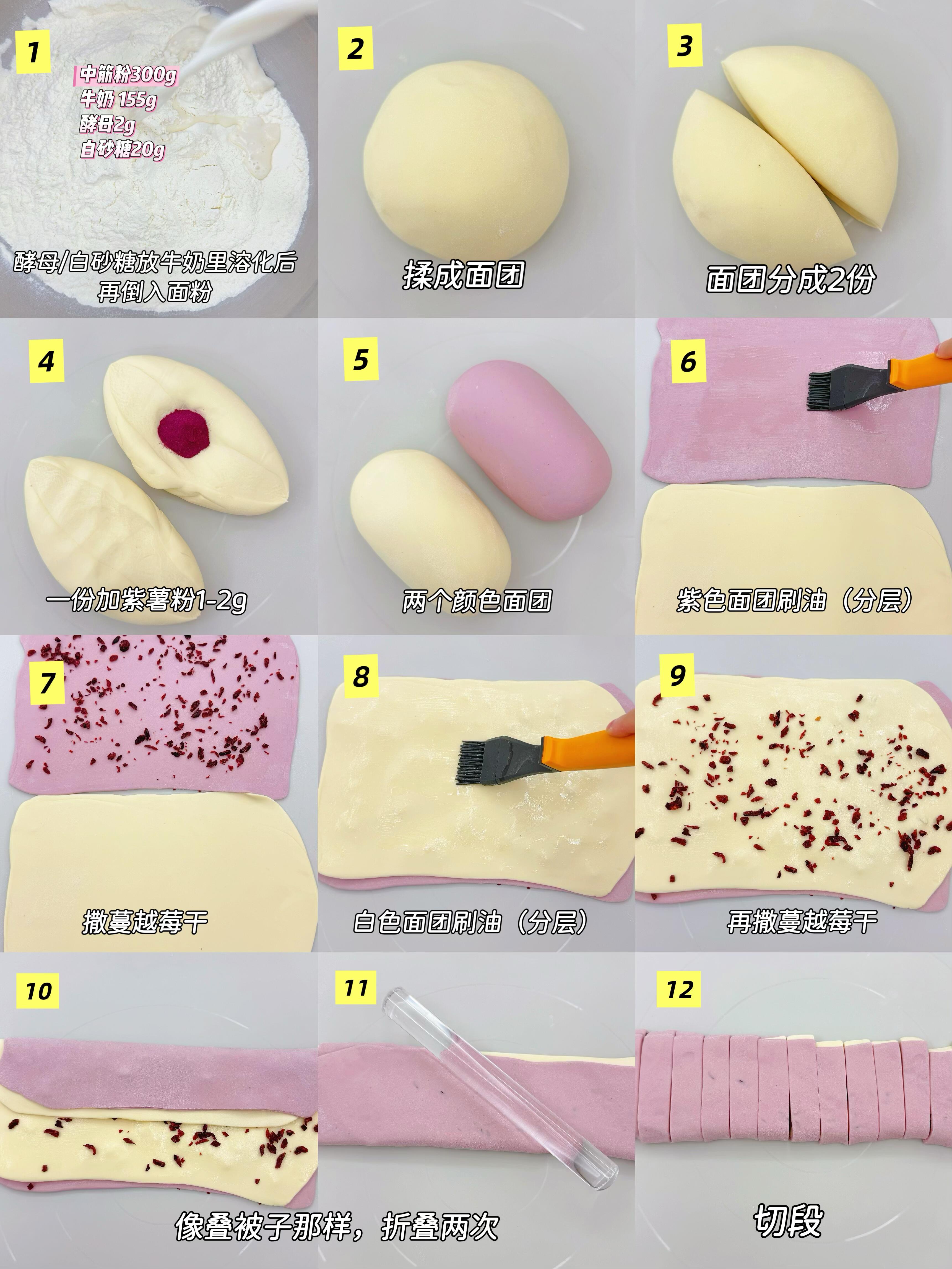 3. 擀面与调味:将两个颜色的面团分别擀成长方形薄片,在紫色面片上刷一层薄薄的油,撒上切碎的蔓越莓干;接着在白色面片上也刷一层油,再撒一层蔓越莓干。这油就像是魔法药水,能让花卷层次分明,而蔓越莓干则是这道花卷的灵魂所在,酸甜的口感瞬间提升了好几个档次。