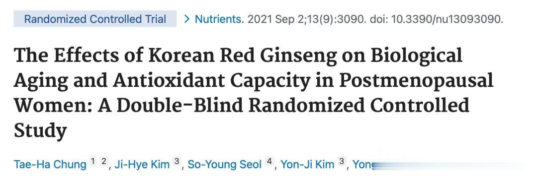 The Effects of Korean Red Ginseng on Biological Aging and Antioxidant Capacity in Postmenopausal Women: A Double-Blind Randomized Controlled Study. Nutrients. 2021 Sep 2;13(9):3090. doi: 10.3390/nu13093090.