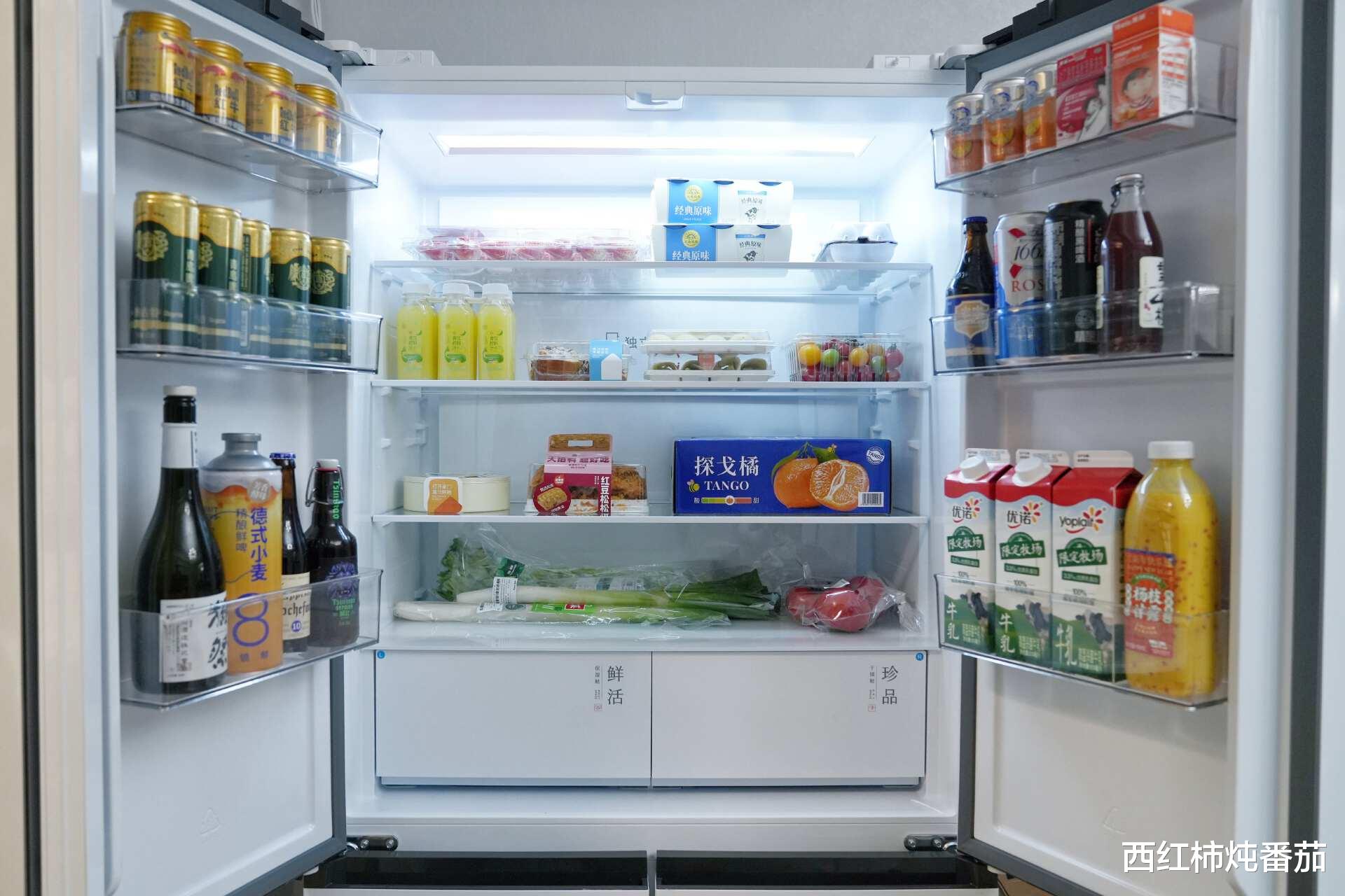 不同的是,十字对开门的每一层都有抽屉,要么是封闭的,要么是敞开的——封闭的抽屉可以保证里面的食材不管怎么放都不用担心滑落,而且抽出后拿取食材也更方便。
