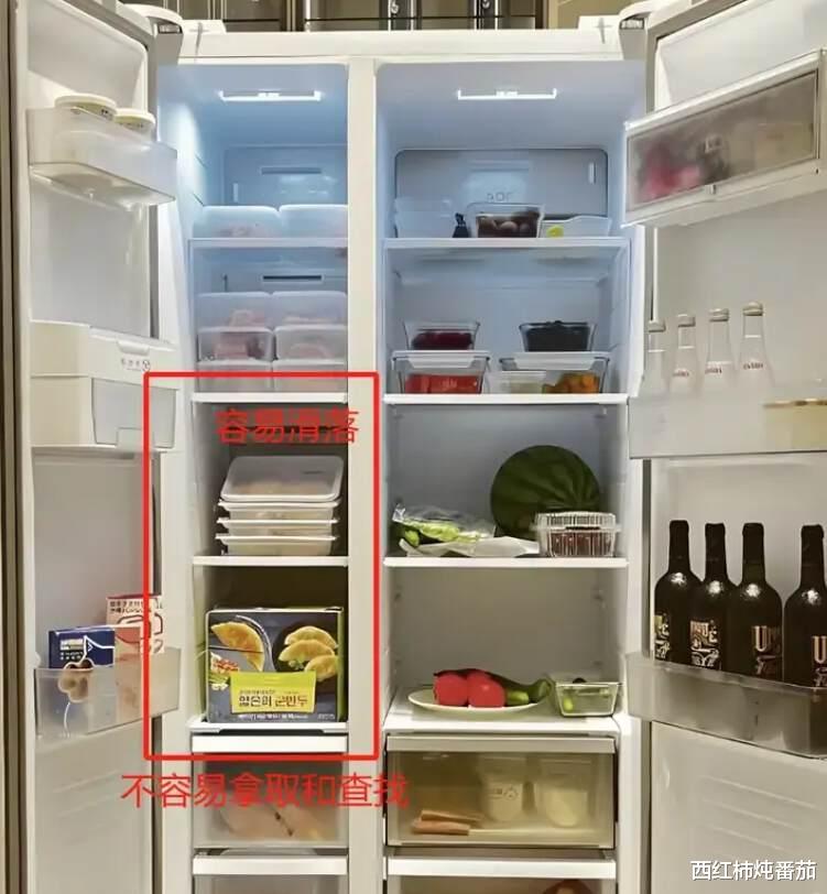 一个是食材摆放一旦不那么平整,上层的东西就容易滑落,所以纵向空间利用率并不高;另一个是每一层空间窄且深,东西放进去后不容易查找,更不容易拿取 ▲