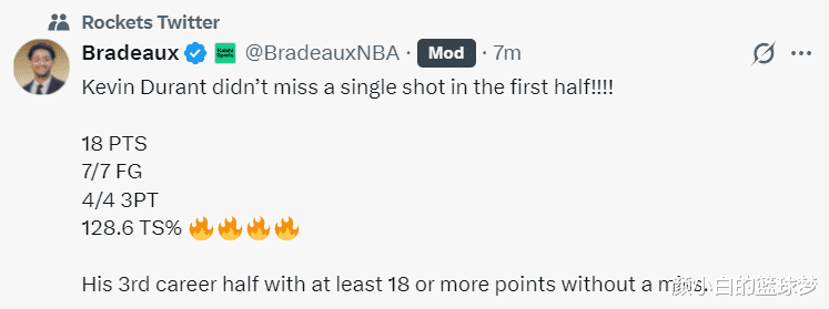 第二节杜兰特只打了8分多钟,他看阿门、申京、谢泼德发挥都不错主动让渡球权,第二节只有2次出手全部命中,半场7中7,三分4中4,拿到18分4篮板1助攻2盖帽,真实命中率高达128.6%,杜兰特生涯第三个半场拿到至少18分且0失误。