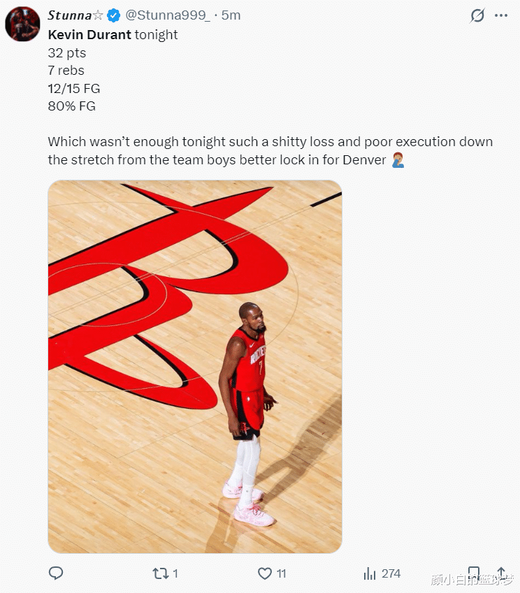 全场比赛杜兰特43分钟,15中12,三分6中4,罚球4中4,拿到32分7篮板2助攻1抢断4盖帽,命中率80%,三分命中率66.7%,这样都输了,杜兰特能不沮丧吗?