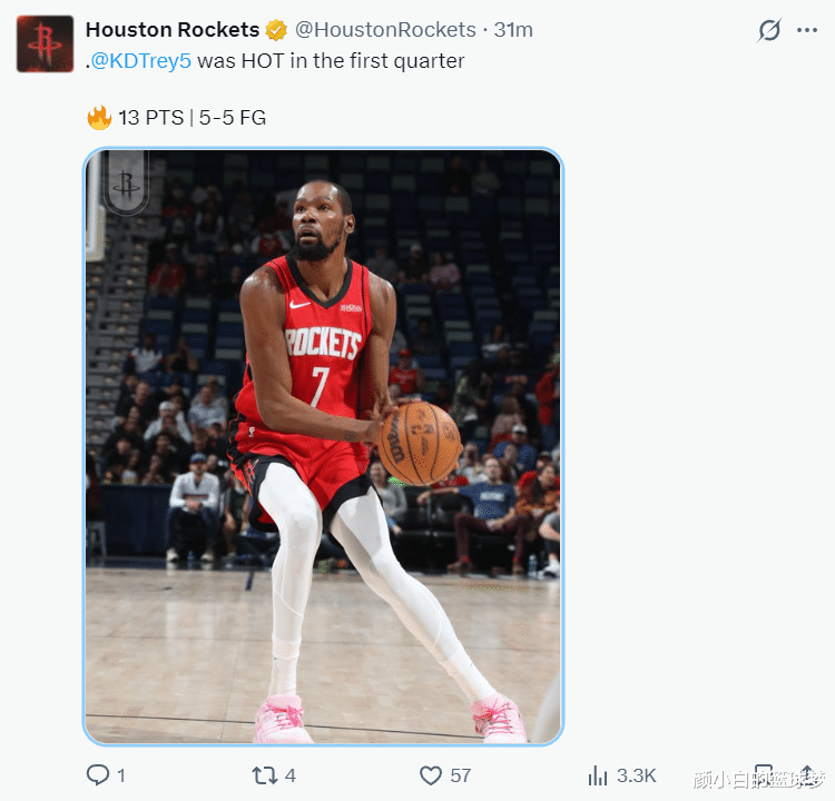 北京时间12月19日,NBA常规赛,火箭鏖战加时赛128-133被鹈鹕逆转吞下二连败。这场比赛火箭一度领先25分之多,但下半场防守先崩,进攻端再崩,末节被鹈鹕扳平,申京再度错失了绝杀球,杜兰特气得甩手,加时赛杜兰特要球海王还不给,决胜时刻杜兰特怒了一个球不传,只可惜绝平三分乌度卡还是没有专门为他画接球战术,谢泼德两个三分绝平不中。
