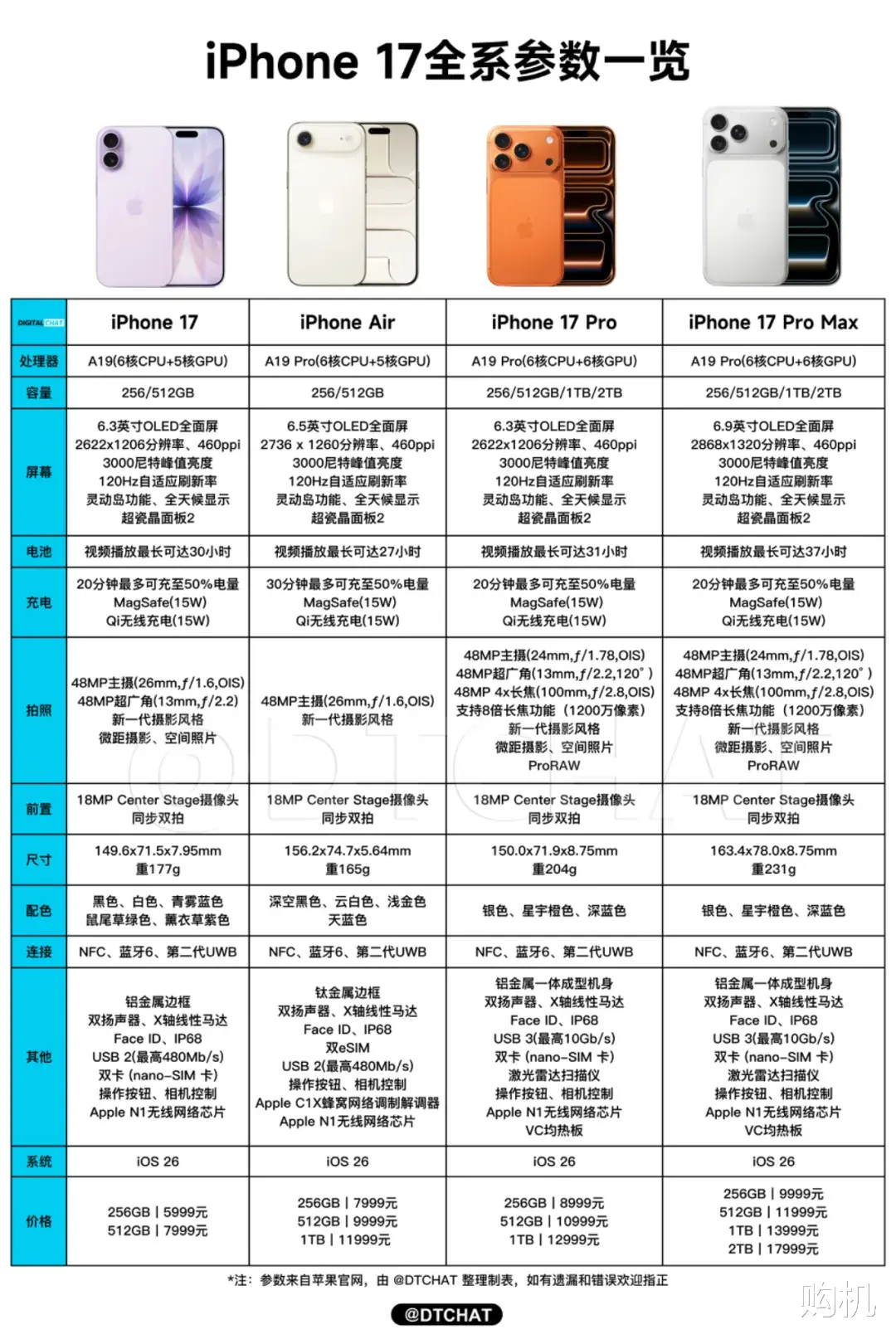 凌晨,iPhone 17系列正式发布,分别是iPhone 17标准版,iPhone Air,iPhone 17 Pro,IP hone 17 Pro Max等四款新机。具体区别可以看一下参数表: